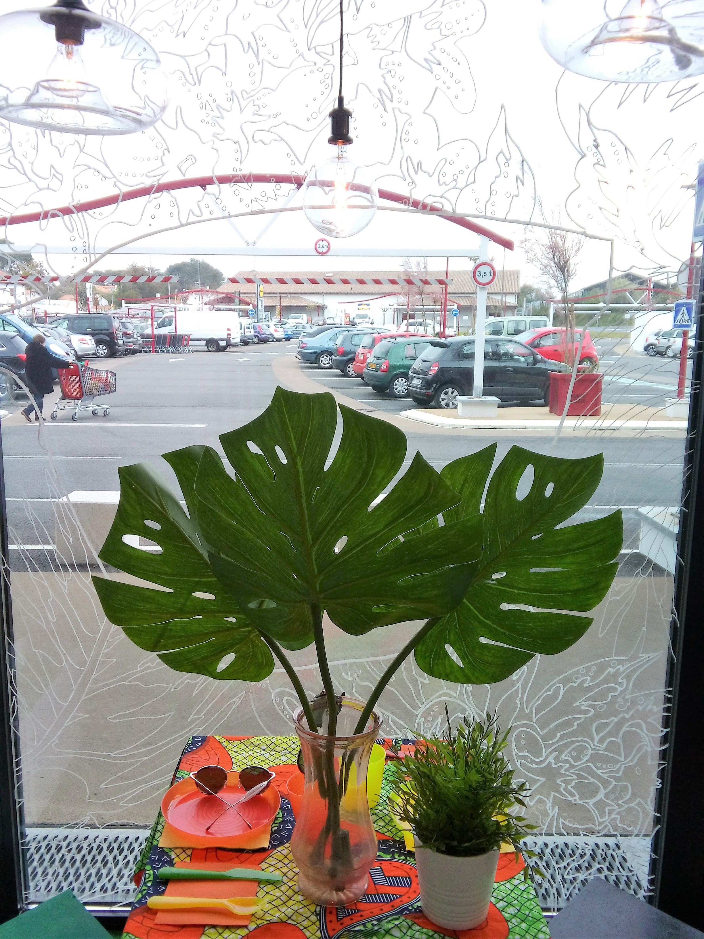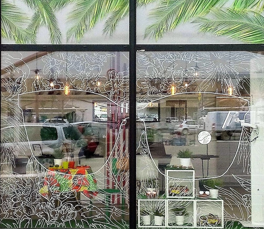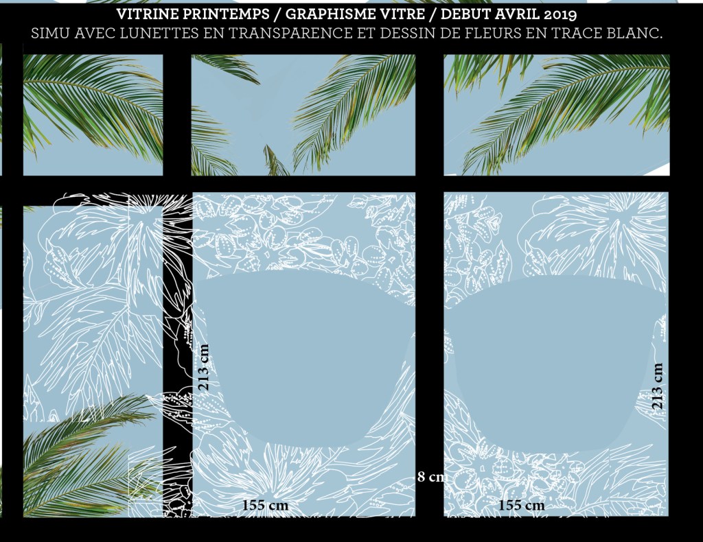 Après 5 heures de dessin, la vitrine printemps de l’opticien très « in » de Bidart est en place. Graphisme original « surf flowers », couleur flashy à tendance wax et mise en avant des lunettes Rip Curl, pour une vitrine printanière au goût de vacances.