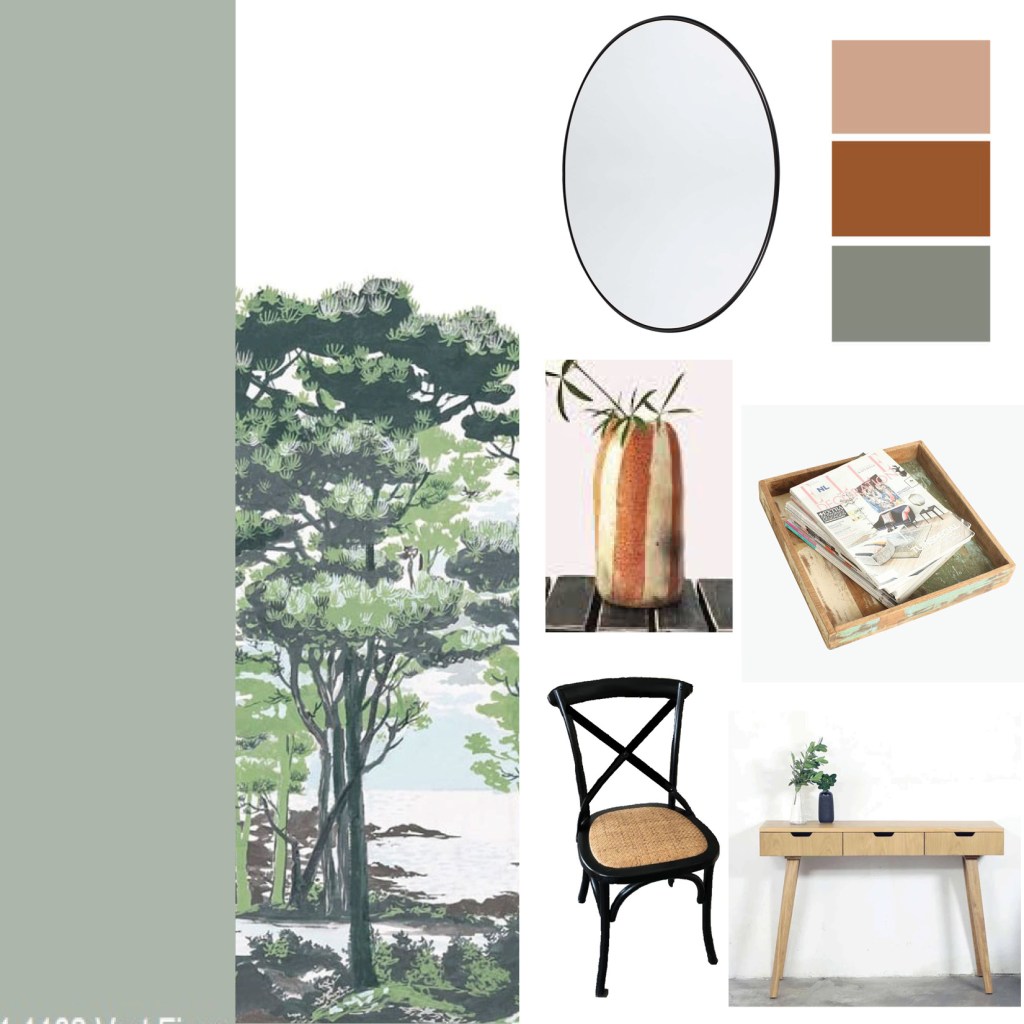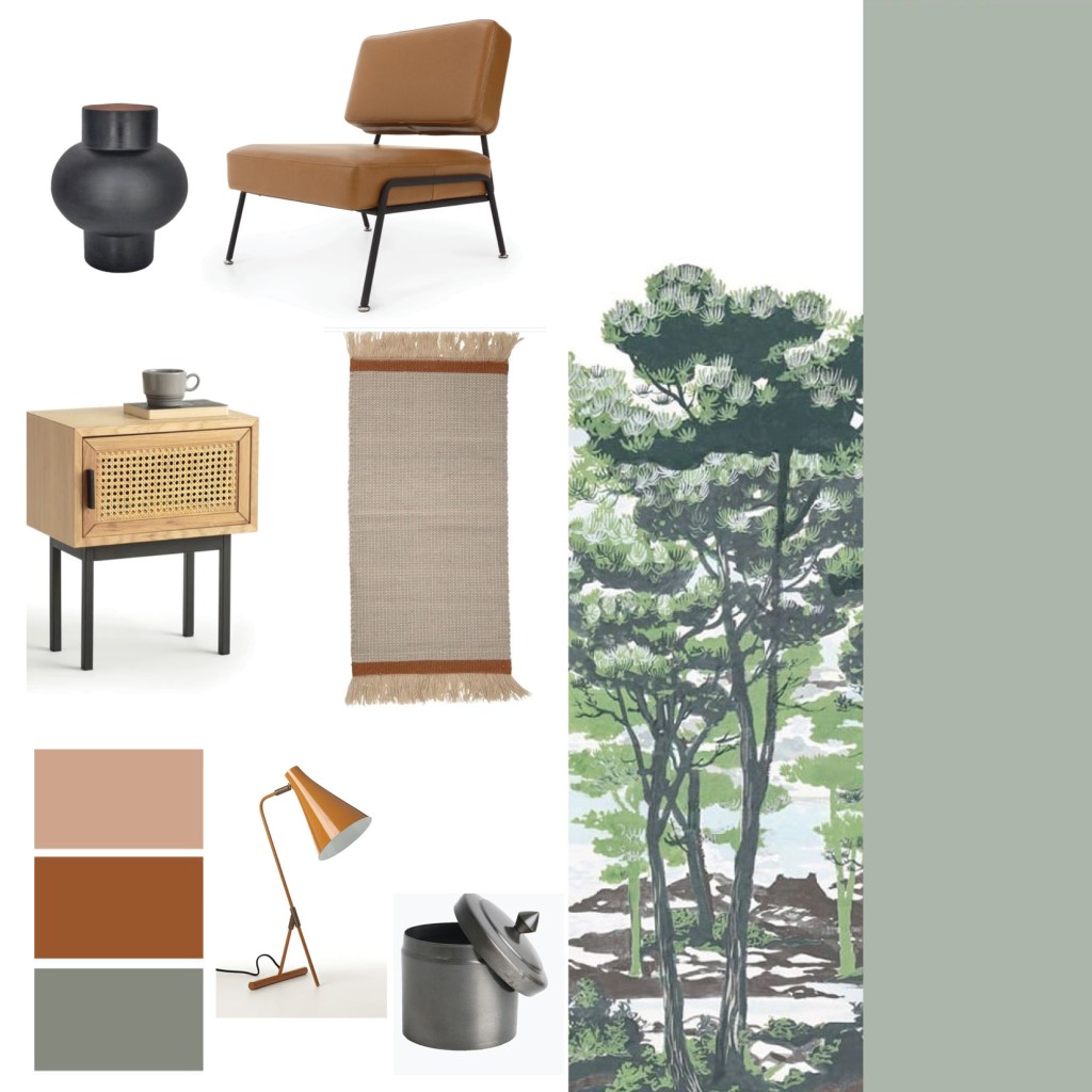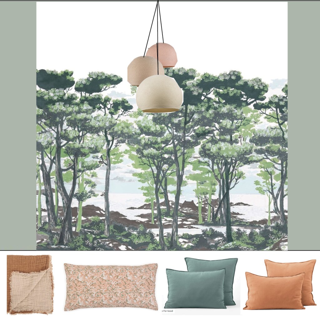 Une chambre parentale en vert sauge, caramel et nude avec des lins lavés, du chêne brut et des cannages. La tapisserie de chez Rebel Walls sera en tête de lit. On trouvera une suspension coupoles de La Case de Cousin Paul, un grand miroir noir de chez Muubs au-dessus d’une console en chêne qui fera office de coiffeuse, un fauteuil cosy en cuir chez Made et le linge de lit Le Monde Sauvage, les accessoires chez Homata.