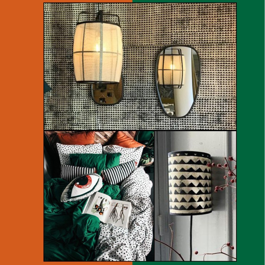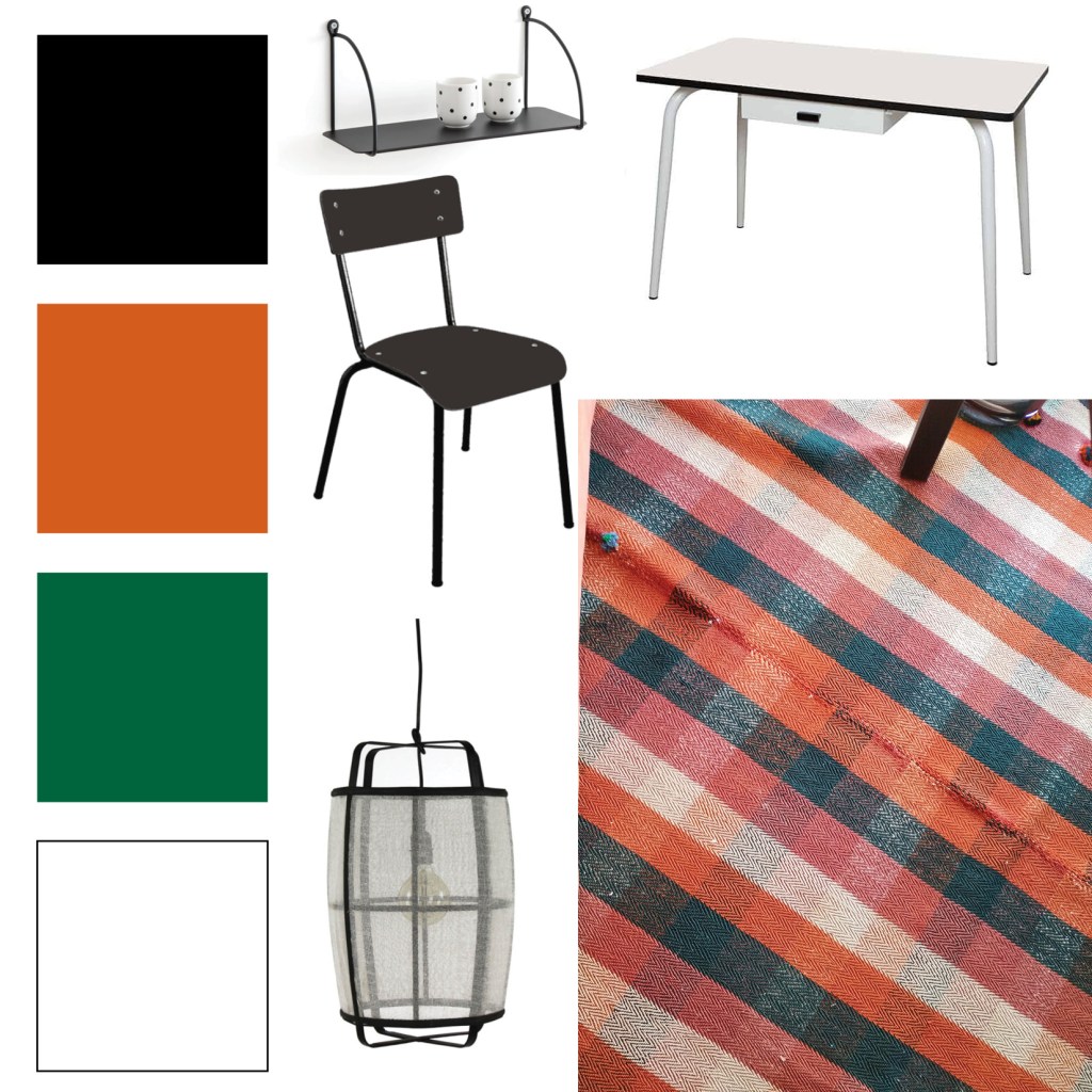 Une chambre d’ado sur fond de papier peint Le Monde Sauvage, en code couleur noir, vert artichaud et orange potiron. Le linge de lit en lin lavé rayé sera réhaussé de coussins de chez Harmony. Le bureau et la chaise Les Gambettes comme des clins d’oeil rétro. Le tout réchauffé par un tapis ancien turc dans les mêmes tons.
