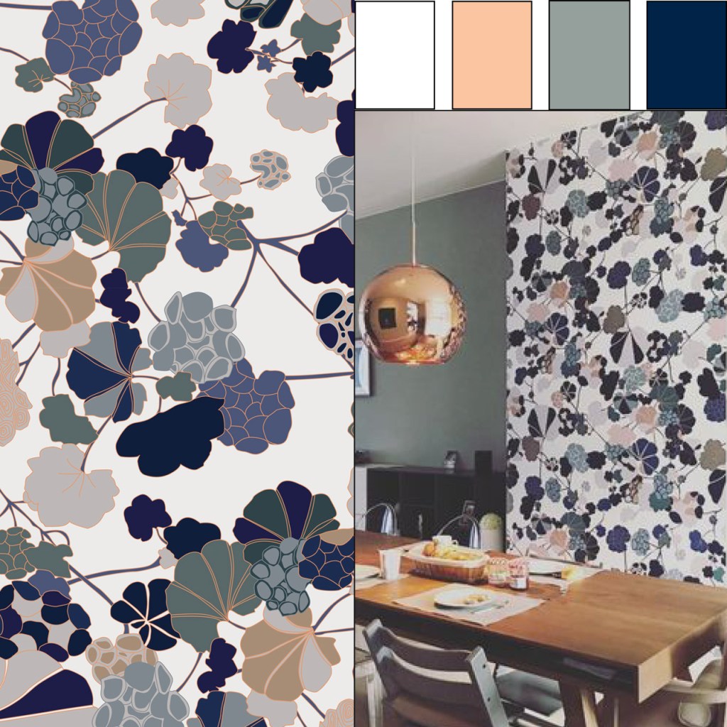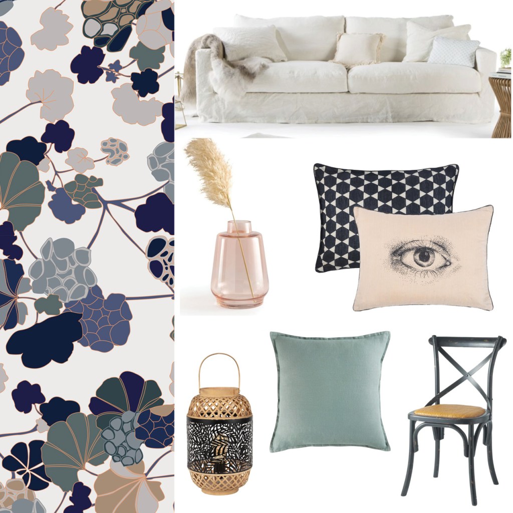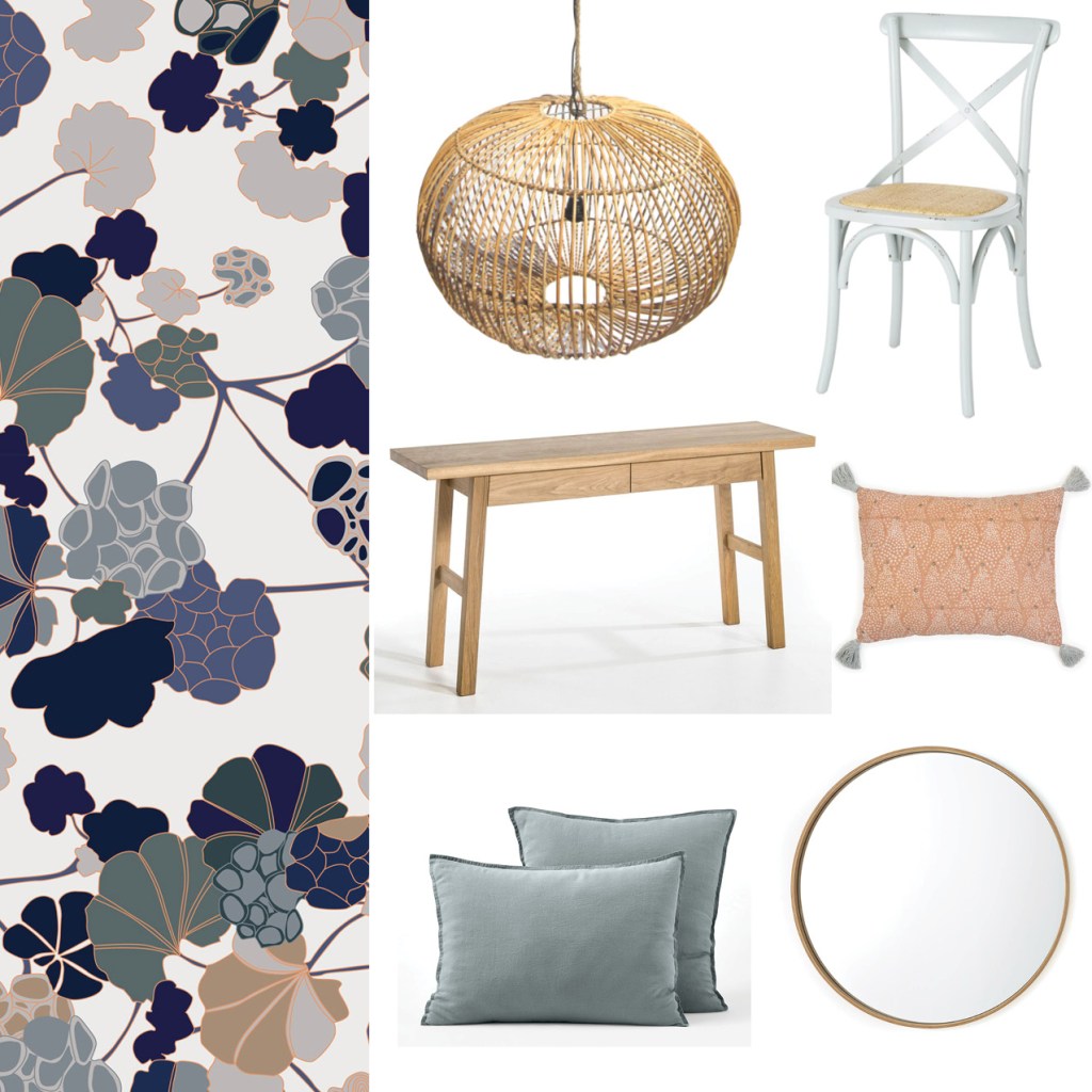 Une chambre de jeune fille pas girlie, en palette couleur bleu nuit, vert de gris, rose blush et blanc, sur fond de la tapisserie Florescence de chez Ressources. Le canapé Bidart de Home Spirit sera relevé du coussin oeil Blink de chez Le Monde Sauvage. La suspension en rotin Taller de Las Indias amènera un peu de rondeur.