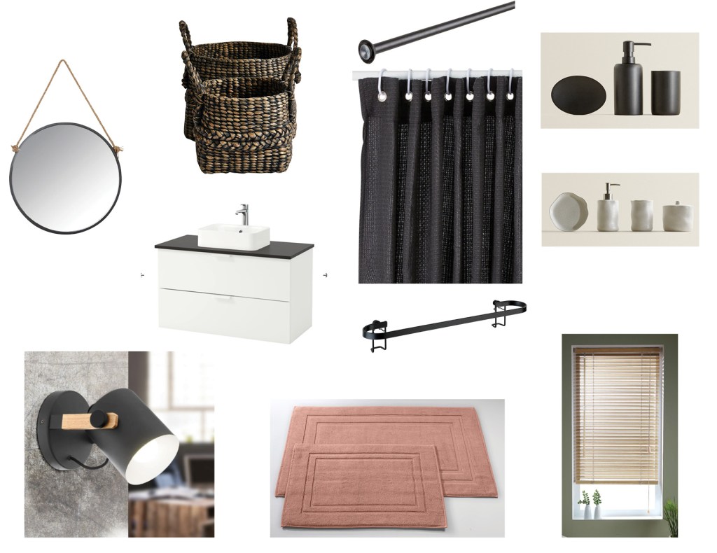 Une petite salle de bain en noir, gris et blush avec un pan en chêne pour réchauffer le mur du meuble vasque et un rappel avec des stores vénitiens en bois clair. De grands rideaux noirs et un grand tapis épais rose blush vont accentuer le côté boudoir. Les accessoires sont de chez Zara Home.