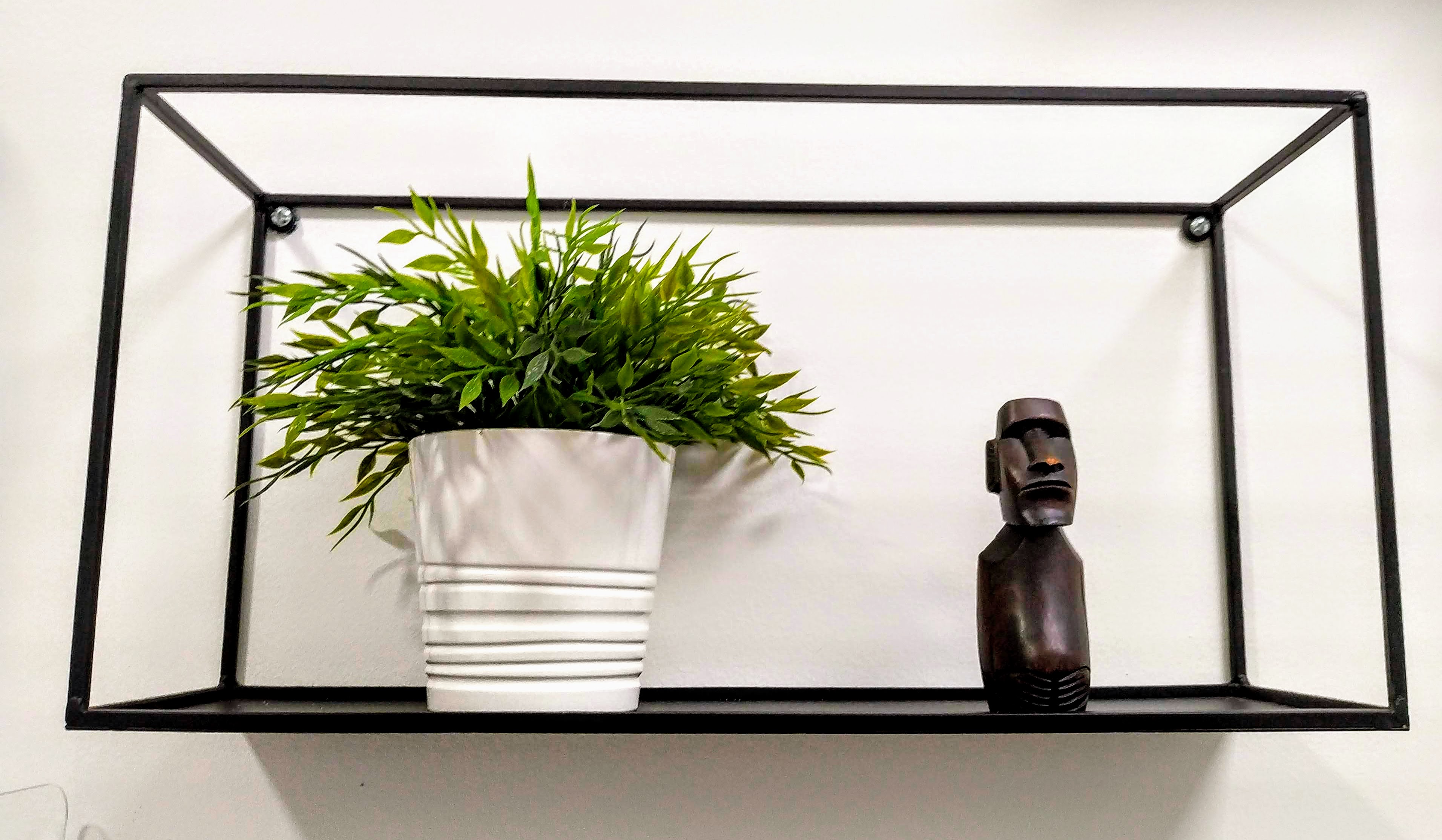 Tout d’abord, nous avons installé des rangements hauts et fermé la partie basse avec un rideau en coton lourd gris anthracite (en continuité du plan de travail). Ensuite, le coin repas à hauteur de bar permet de voir la partie boutique et possède aussi des rangements fermés. Nous avons gardé les codes couleurs et matières du magasin, bois clair, métal noir et blanc. Les étagères déco reprennent les éléments végétaux. Un mur de cadres a été créé comme une parenthèse divertissante quand le client est en examen. Ces cadres mélangent des oeuvres d’artistes locaux et des affiches vintage sur le thème des lunettes.