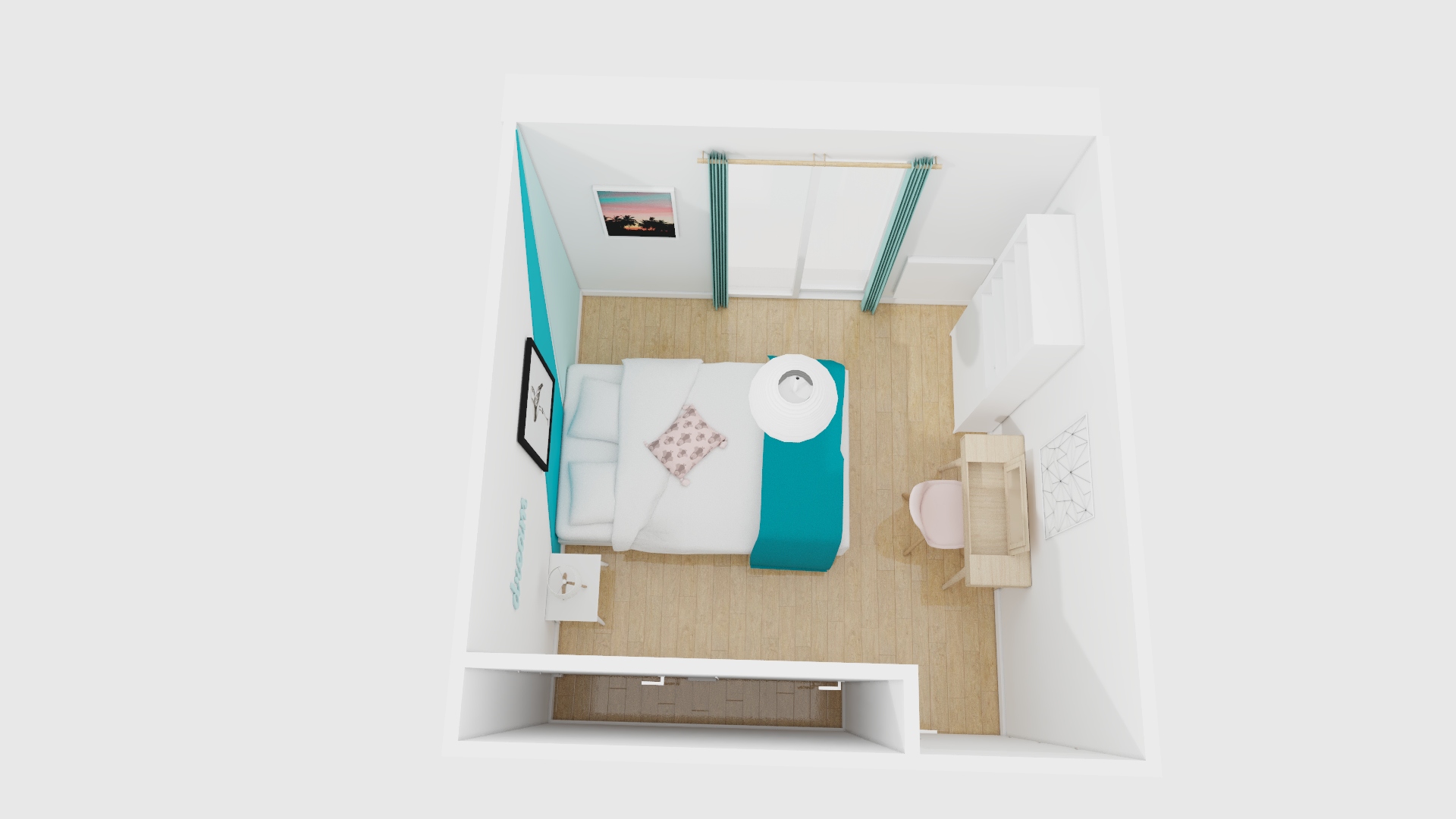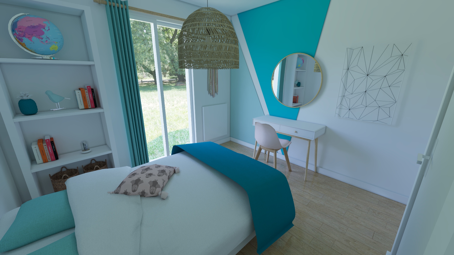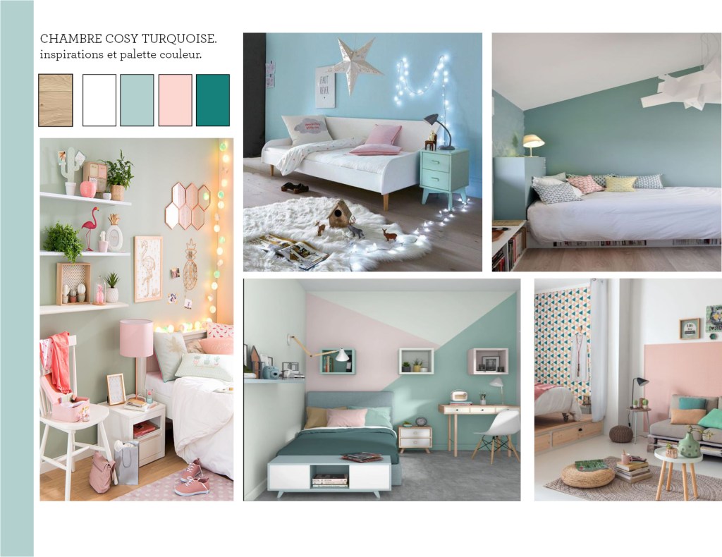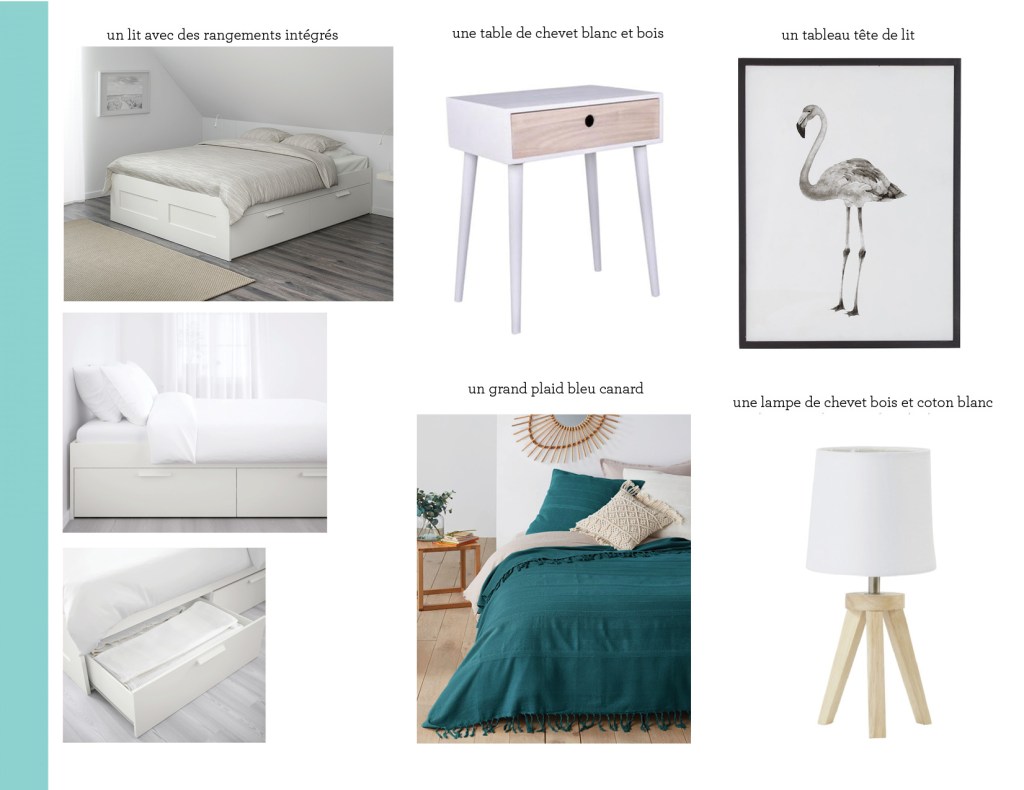 Ce nouveau projet nous amène à Socoa pour aménager entièrement la chambre d’une jeune fille. J’avais un budget très serré de 500€ pour une petite chambre avec des besoins précis de mobilier (lit double coffré, coiffeuse/bureau, bibliothèque) et des contraintes de rangements fermés. La chambre fait 10m2 avec un sol en chêne clair, les murs blancs et une belle luminosité. Après sondage de ses goûts (et dégoûts!), j’ai travaillé sur 2 ambiances couleurs : « cosy turquoise » (sa couleur favorite) réhaussé de bleu canard et de rose pâle ; et « pink pastel » autours des gris et roses plus doux. Ma jeune cliente a choisi le thème bleu d’inspiration scandinave.
