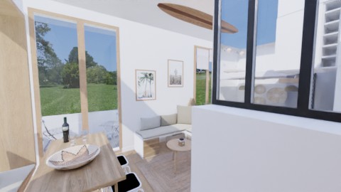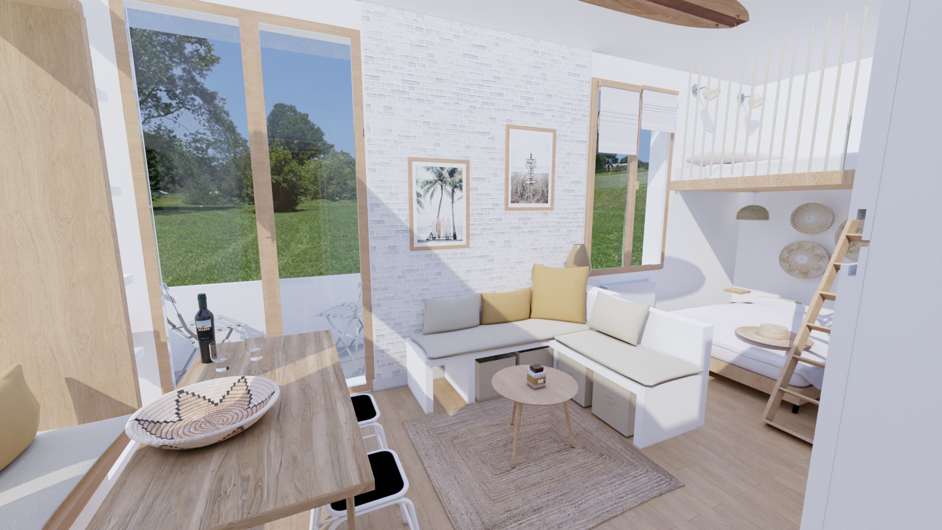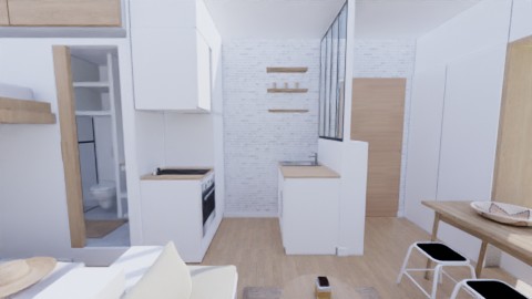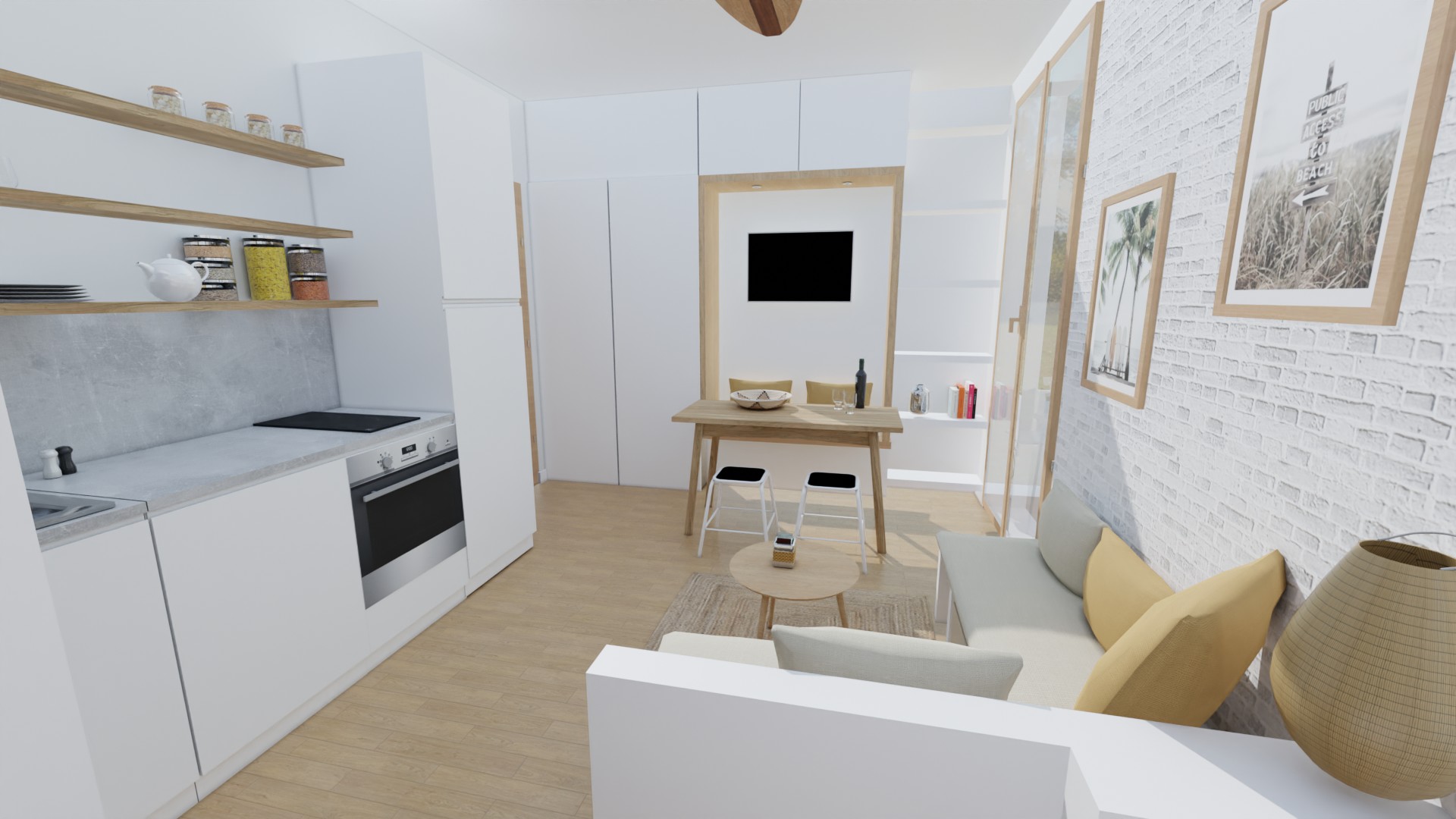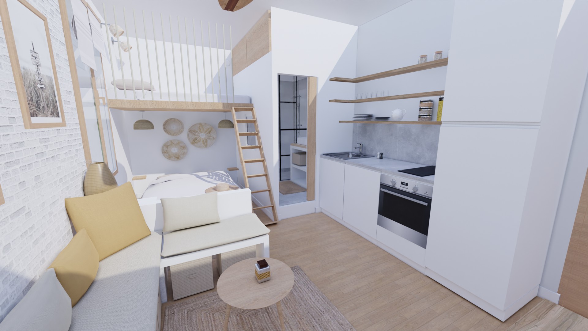 Ce projet nous emmène à Guéthary, dans un studio de 21m2 qui n’est qu’un plateau vide et nu avec une belle luminosité. Mes clients souhaitent en faire un petit cocon d’évasion pour leurs week-ends. Challenge : 4 couchages, une cuisine, une salle de douche, un coin repas et un coin salon !