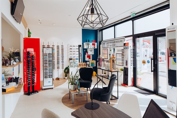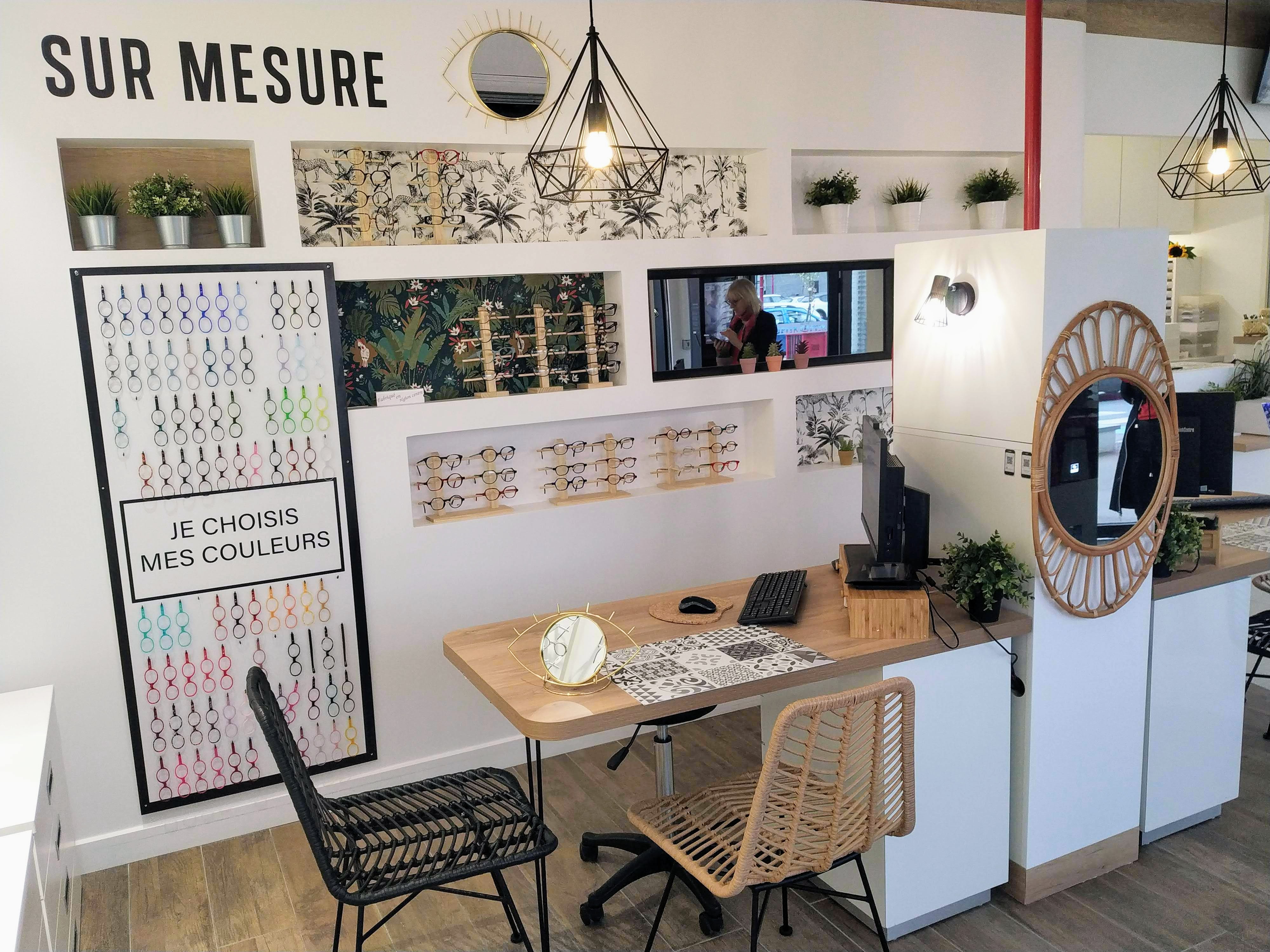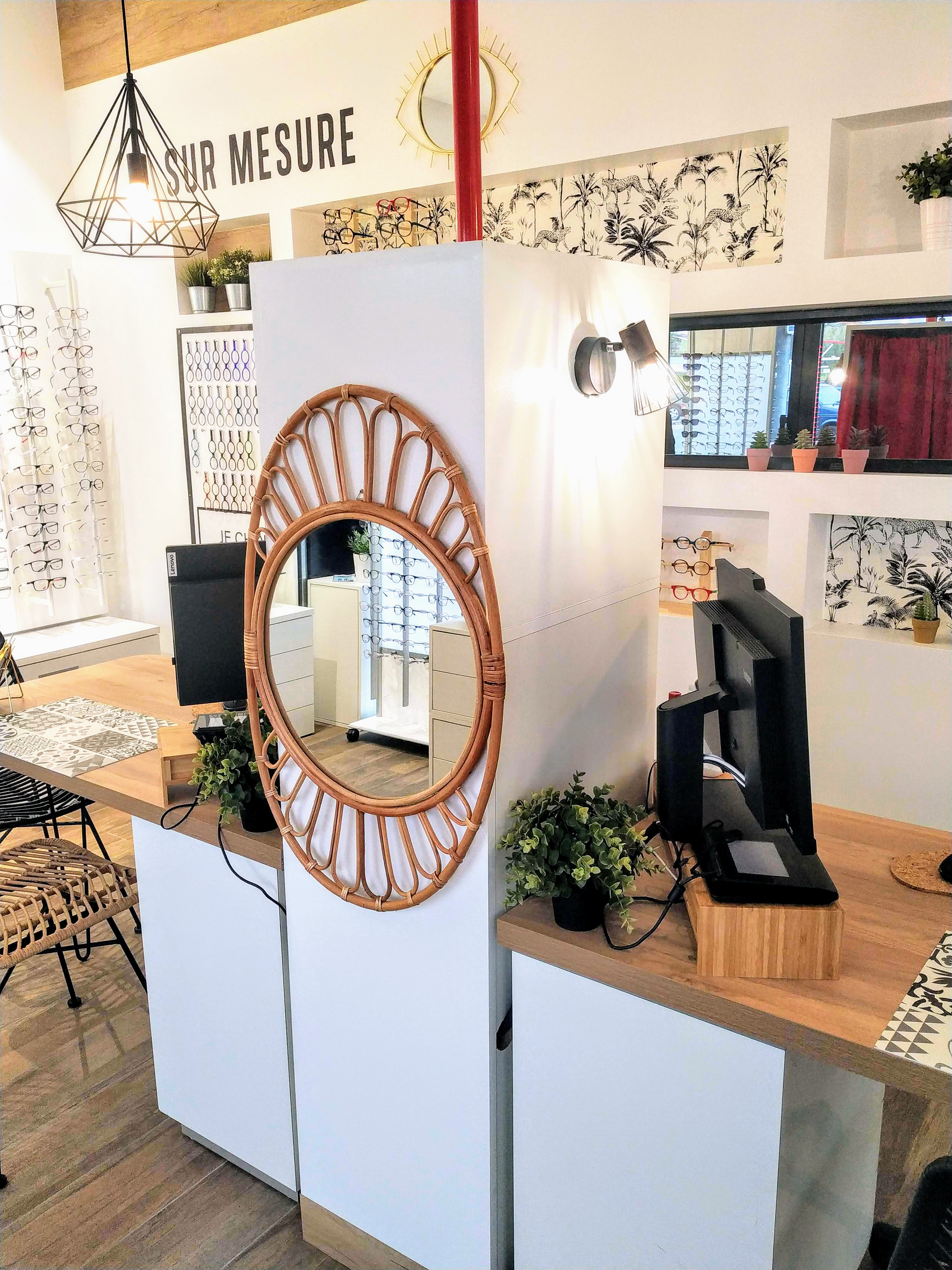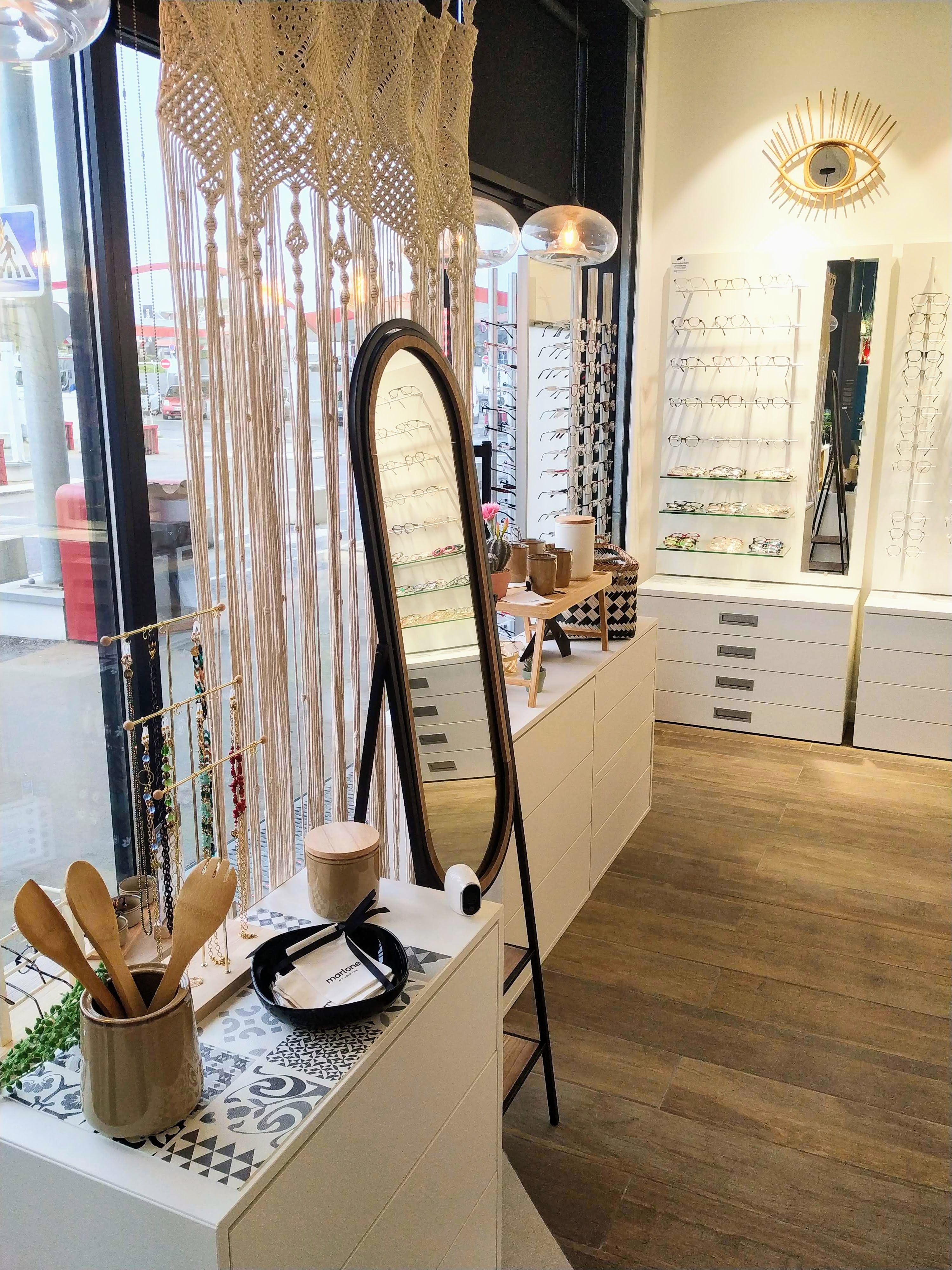 Transformation radicale pour Bidart Optik ! Atmosphère lumineuse et apaisante comme à la maison, clarification de l’espace et de la circulation, espaces de travail pratiques, rangements multiples, matières chaleureuses et clins d’oeil optiques…
