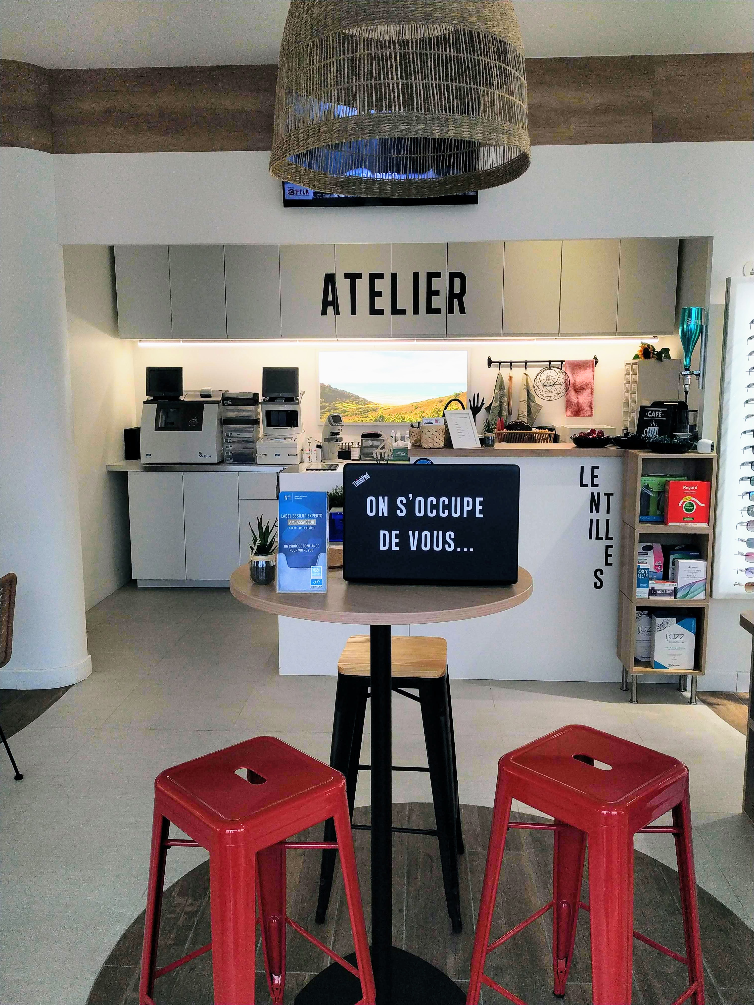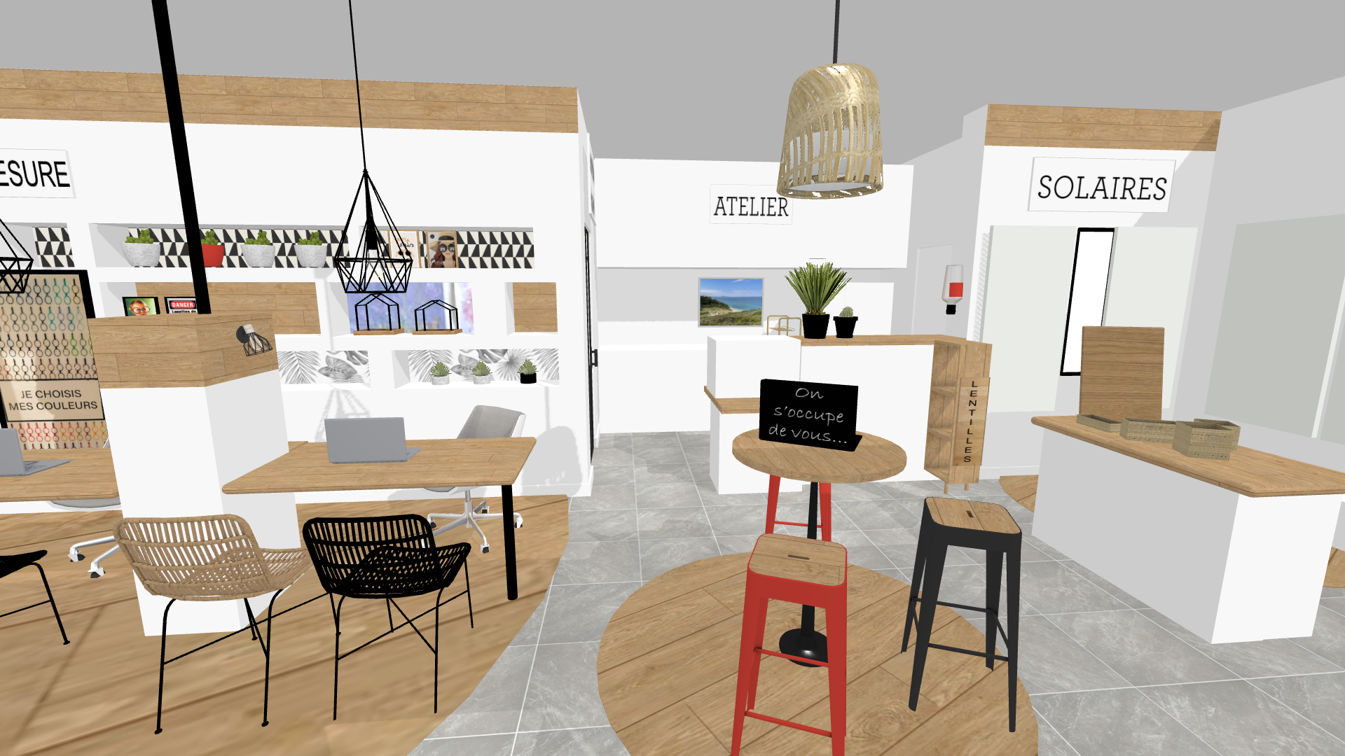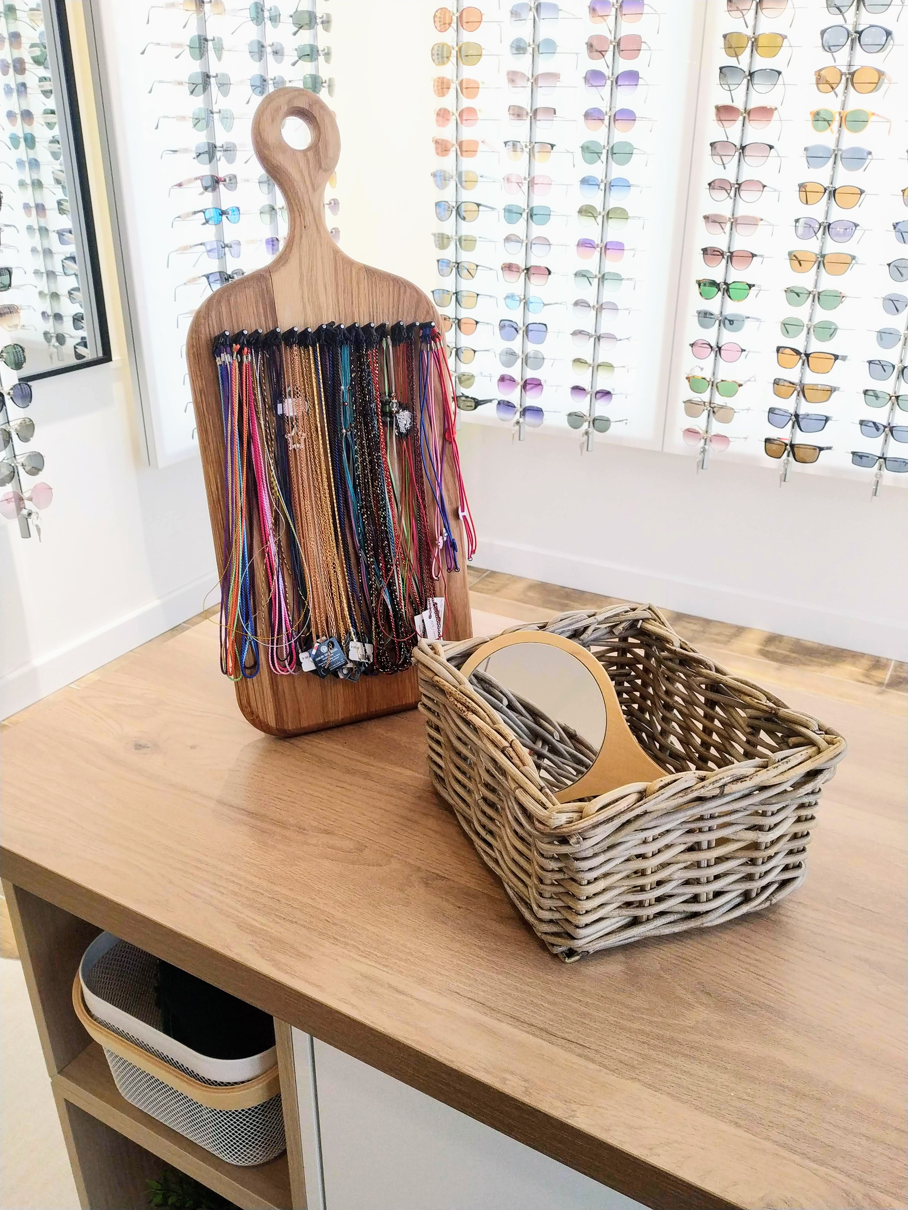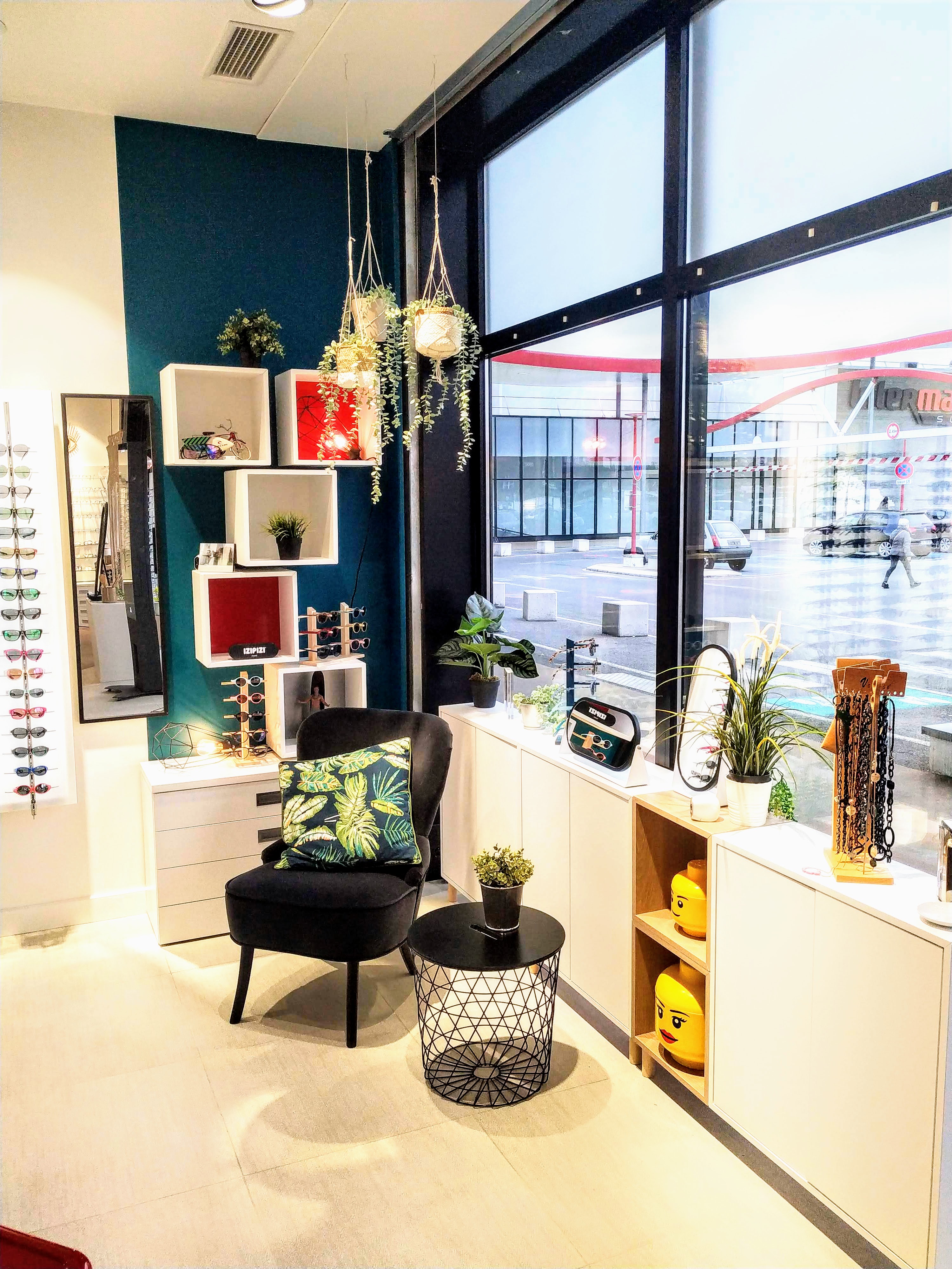 Transformation radicale pour Bidart Optik ! Atmosphère lumineuse et apaisante comme à la maison, clarification de l’espace et de la circulation, espaces de travail pratiques, rangements multiples, matières chaleureuses et clins d’oeil optiques…