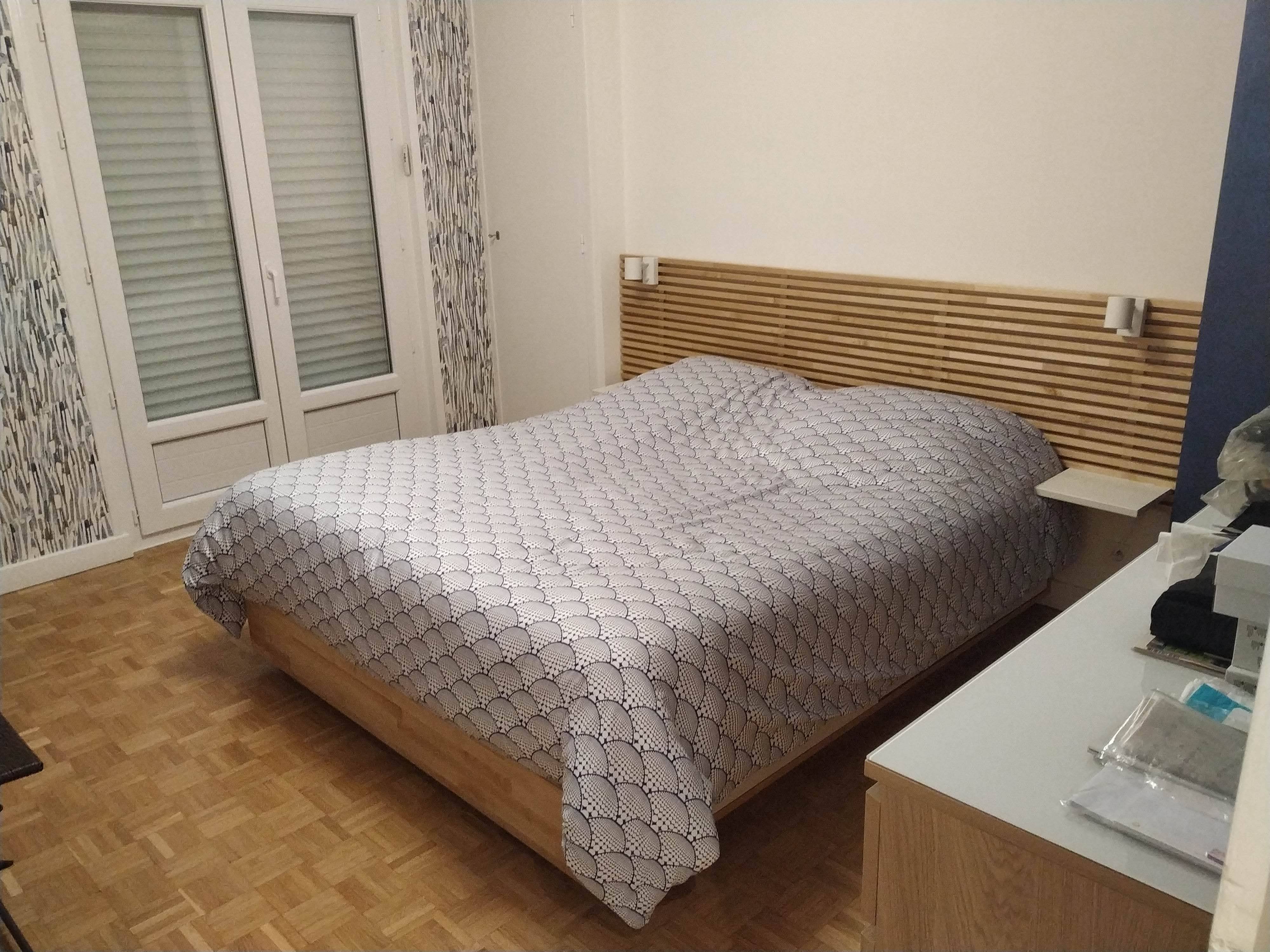 Peinture Cromology Chakras velours, linge de lit Claire Gasparini, armoire Detjer, bureau Bolia, tapis vintage Turquie, table de chevet Sarah Lavoine.