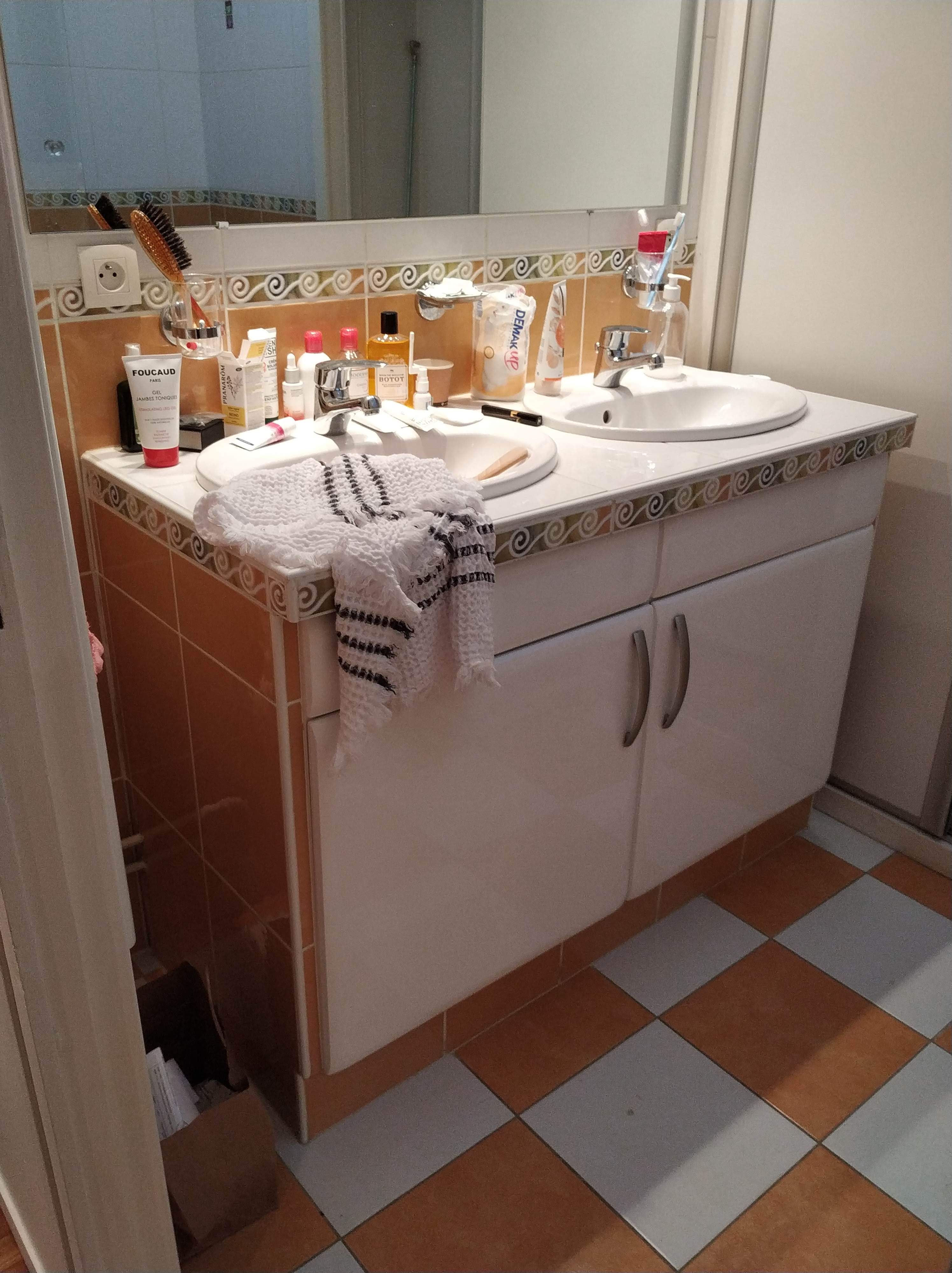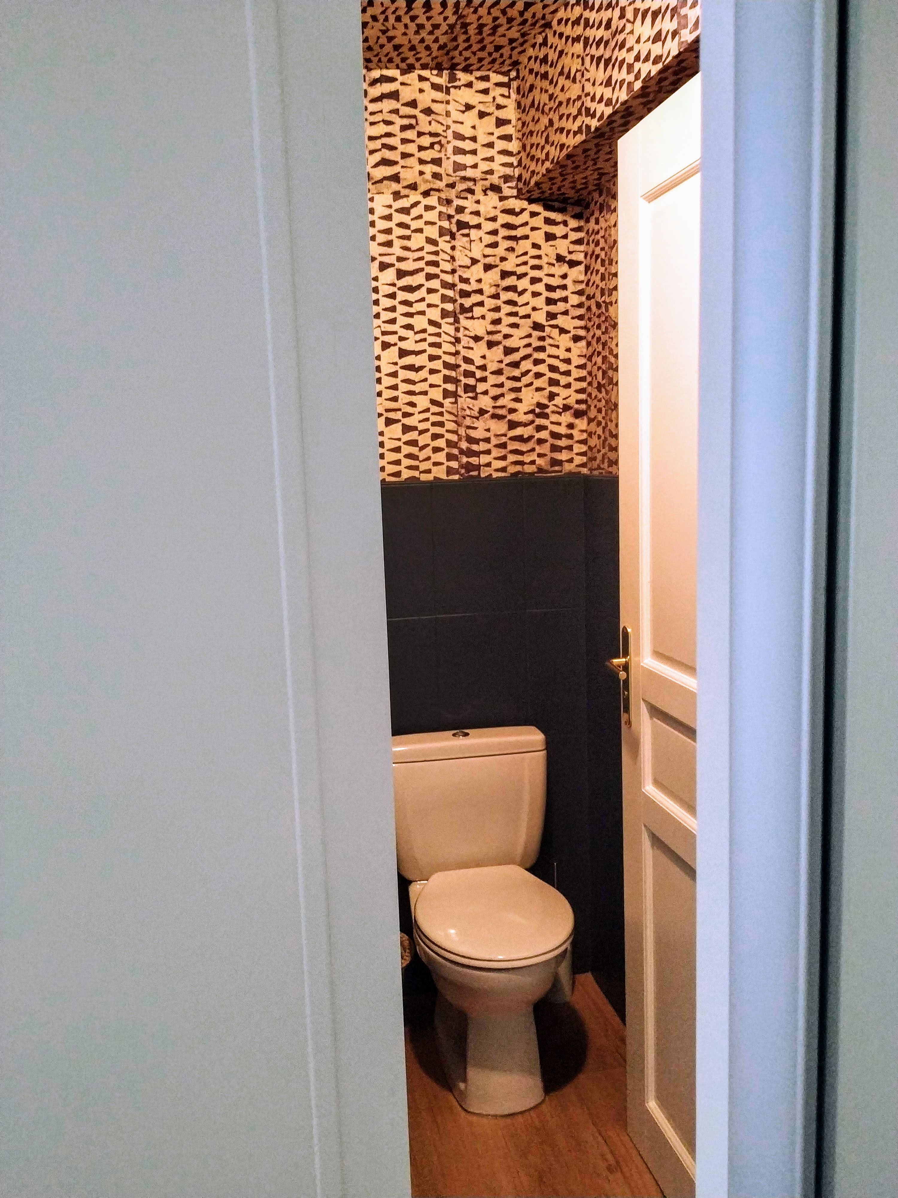 Dans la salle de bain, peinture Cromology velours Salamandre et Résonnance, plan de travail stratifié chêne clair, tabouret Some Slow Concept, ustensiles Centrakor. Dans les toilettes, peinture Cromology Ardoise et papier peint Le Monde Sauvage.