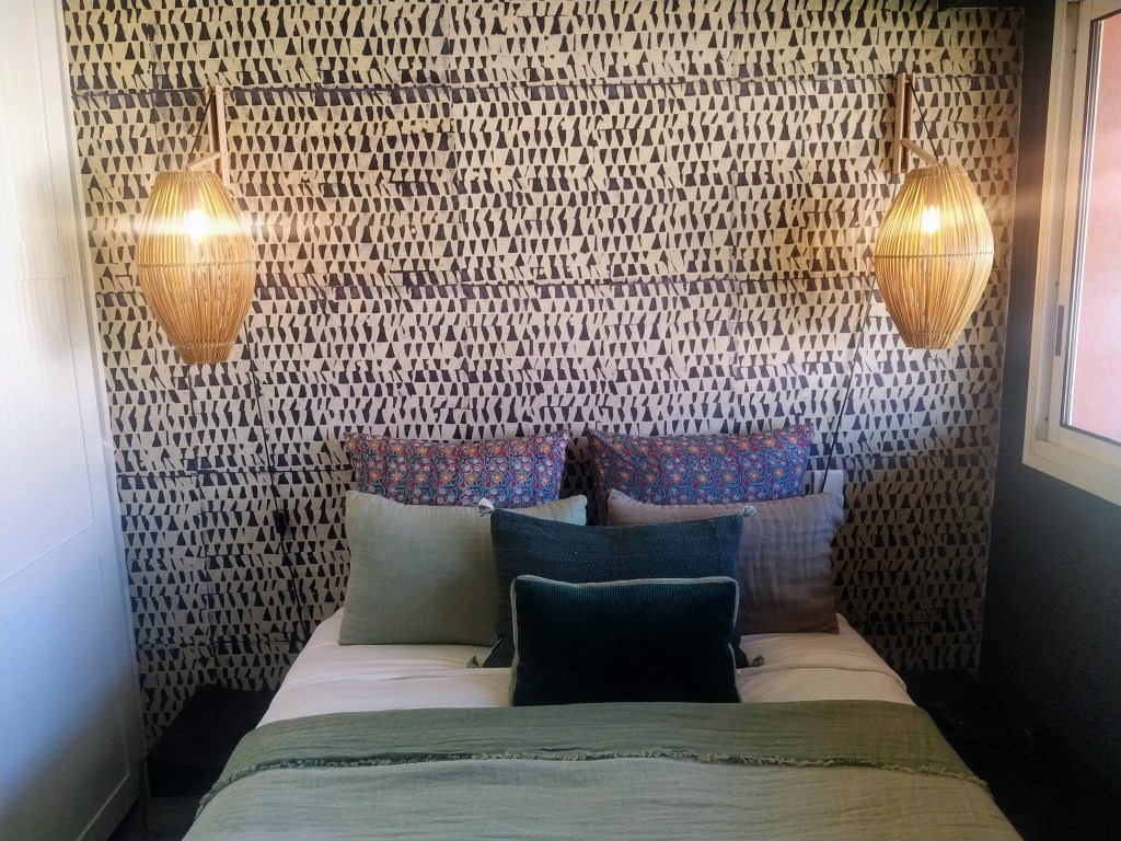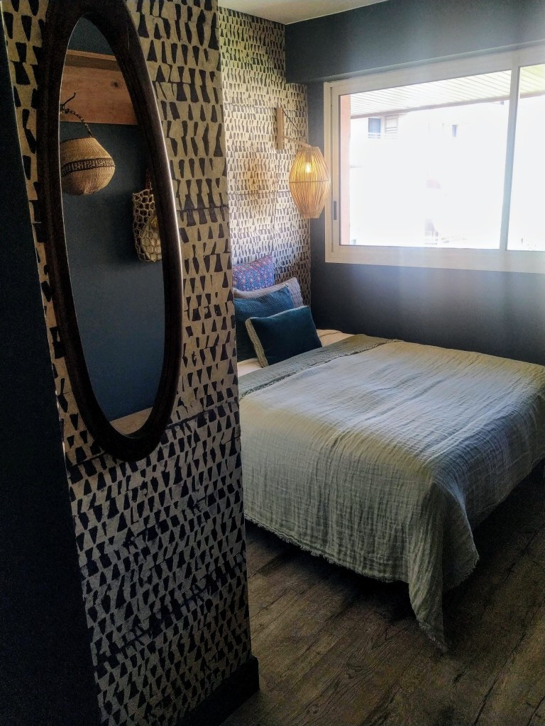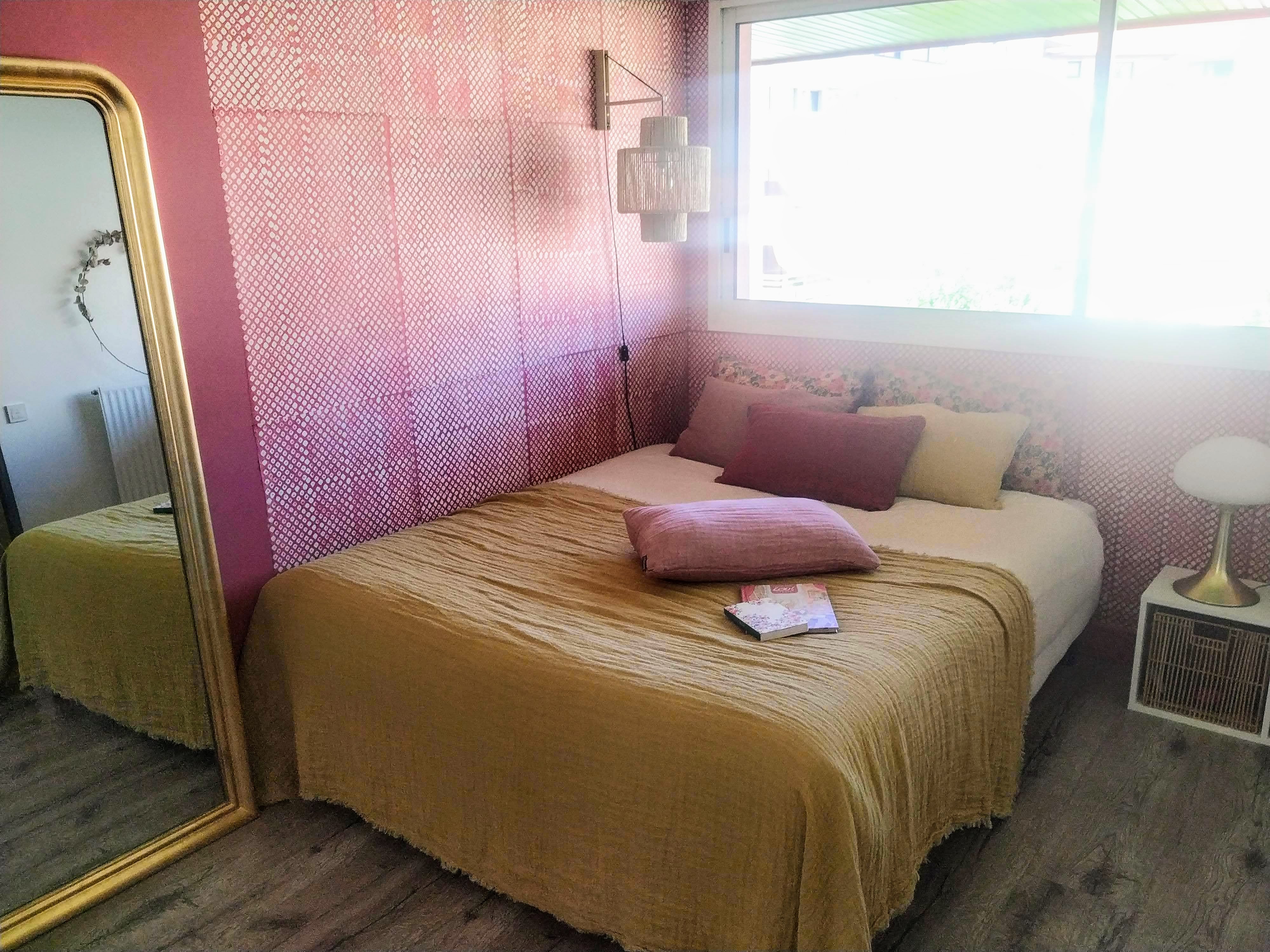 J’ai choisi le papier peint Japan chez Le Monde Sauvage et la peinture Bangkok coordonnée, pour illuminer et personnaliser cette chambre. L’ensemble de lit est un mix de coussins et plaid Le Monde Sauvage et Claire Gasparini en lin gaufré et coton en bloc print. Grand miroir vintage en laiton doré, et lampes de table en rappel chez Leroy Merlin. Les fibres naturelles du tapis et des appliques viennent instiller une atmosphère de vacances.
