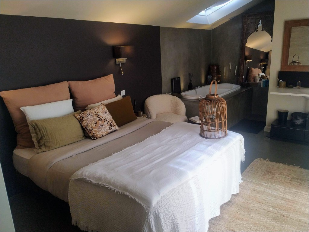Une chambre comme un cocon, dans des tonalités naturelles profondes : béton ciré Kaki, peintures Brun Presque Noir et Chaux de Marrakech chez Argile. Linge de lit en douceur, en cimarron et blanc chez Harmony et en lin gaufré Owaka et Zurich. Un petit fauteuil bouclette beige pose l’atmosphère enveloppante. Le miroir ancien en bois foncé, trouvé chez Bello Horizonte, invite au voyage et à l’évasion…