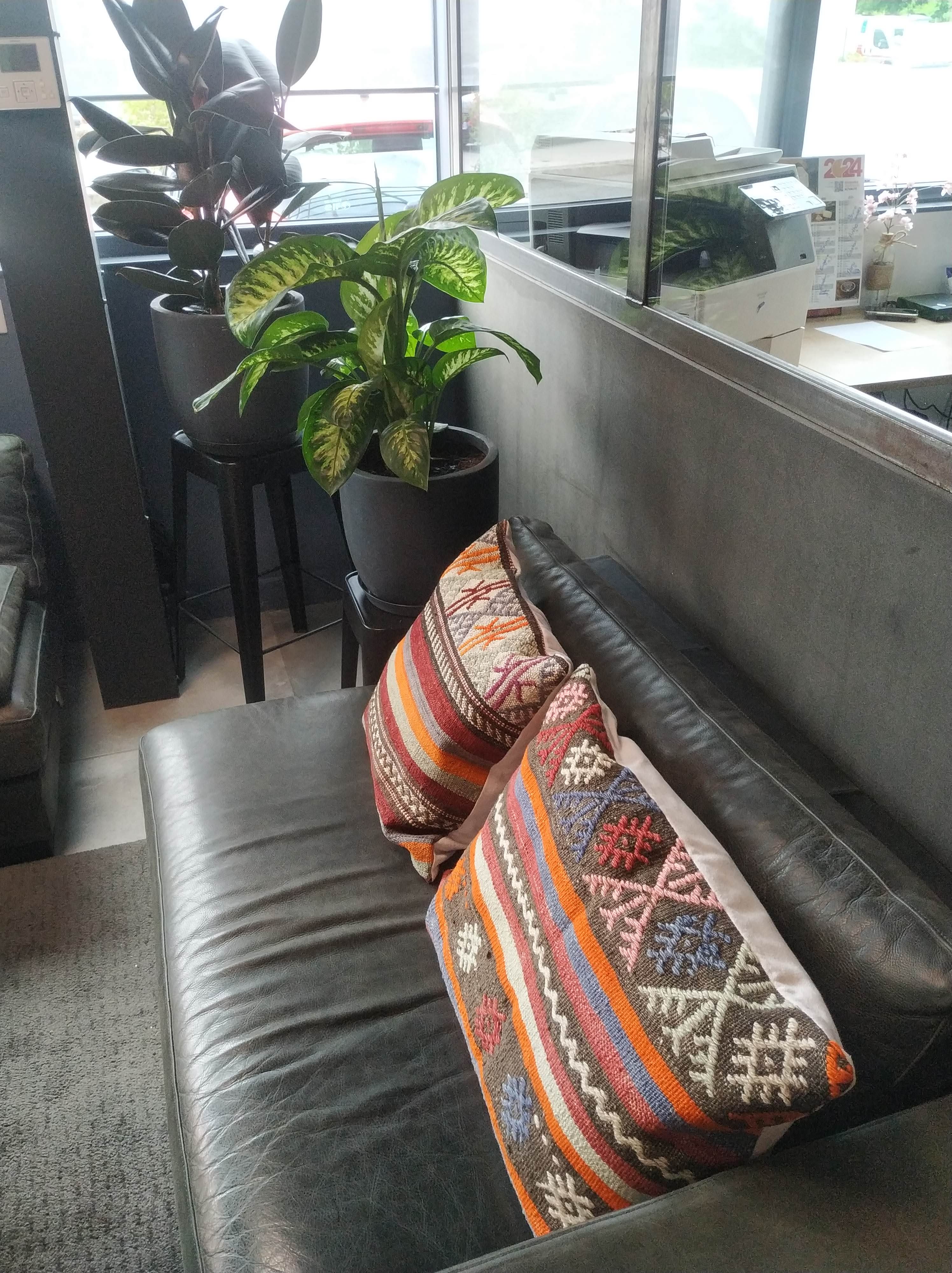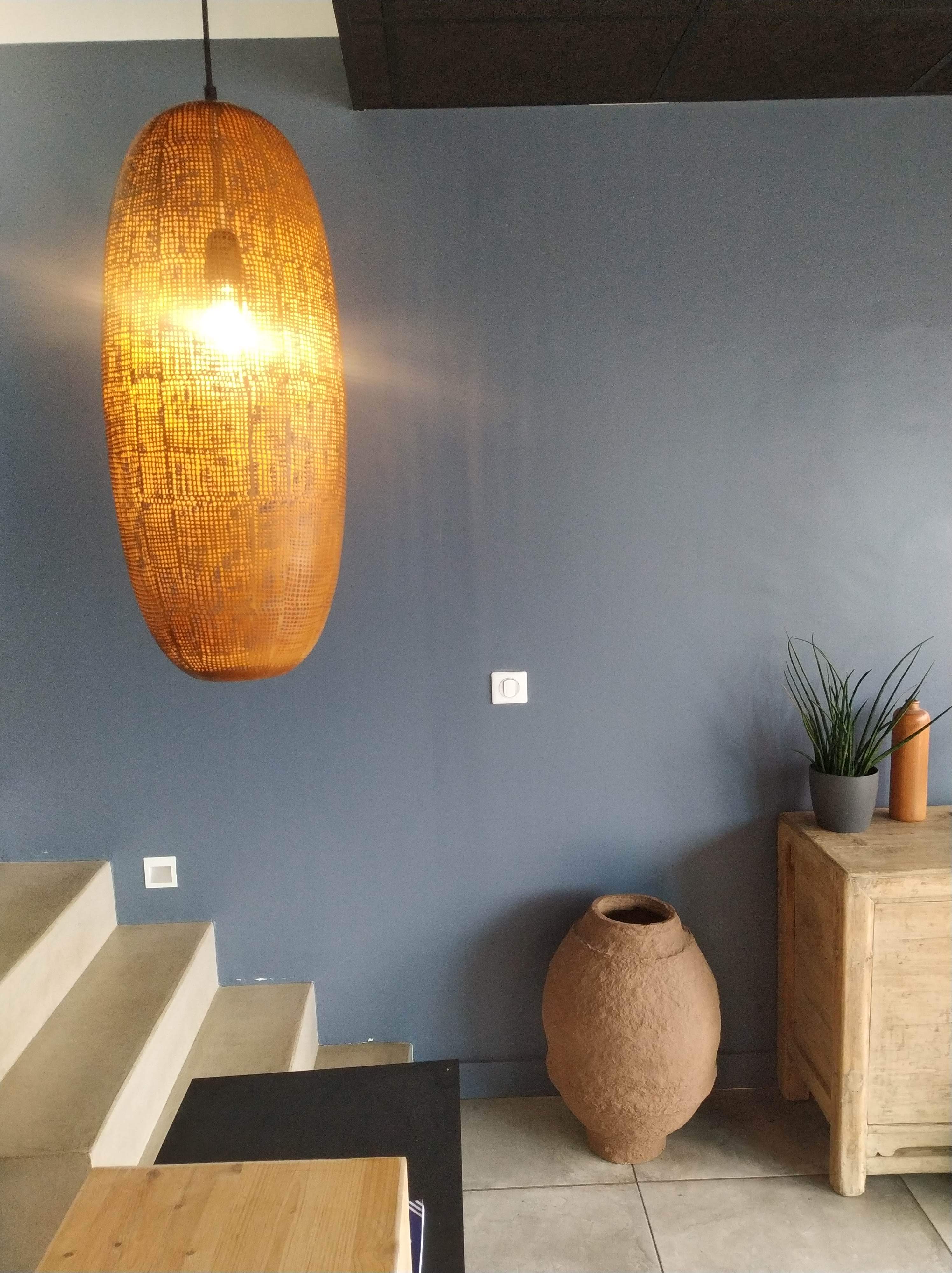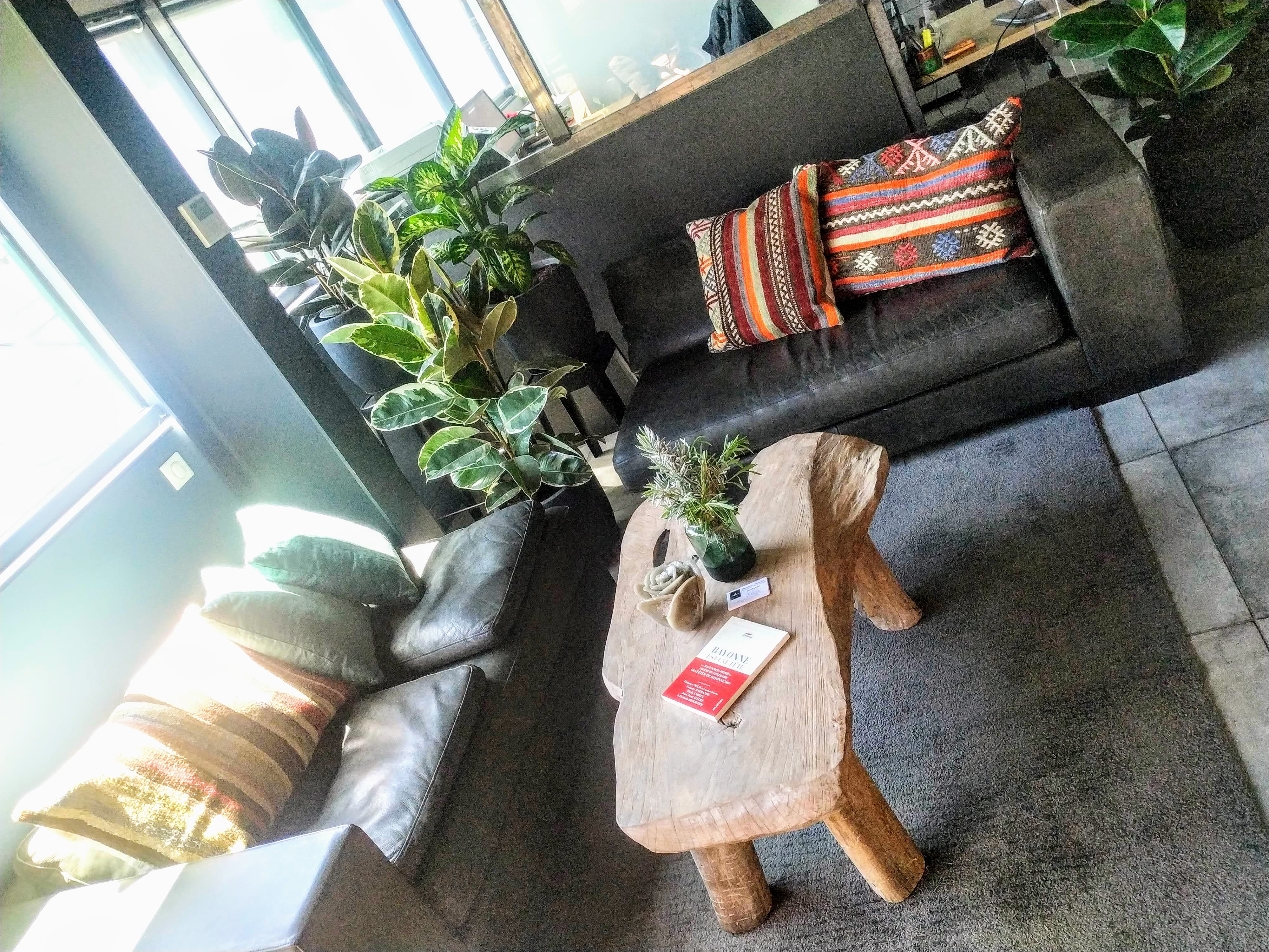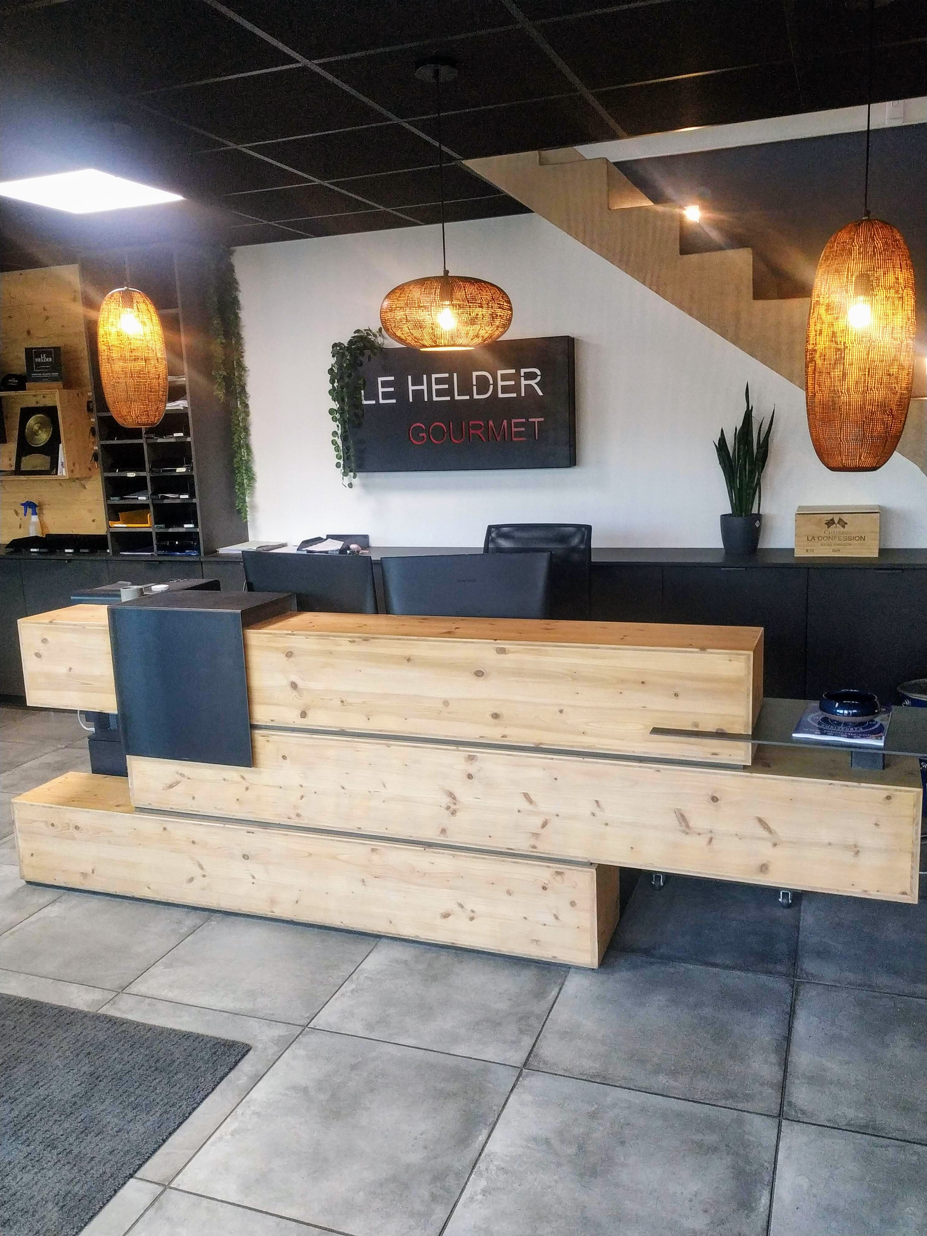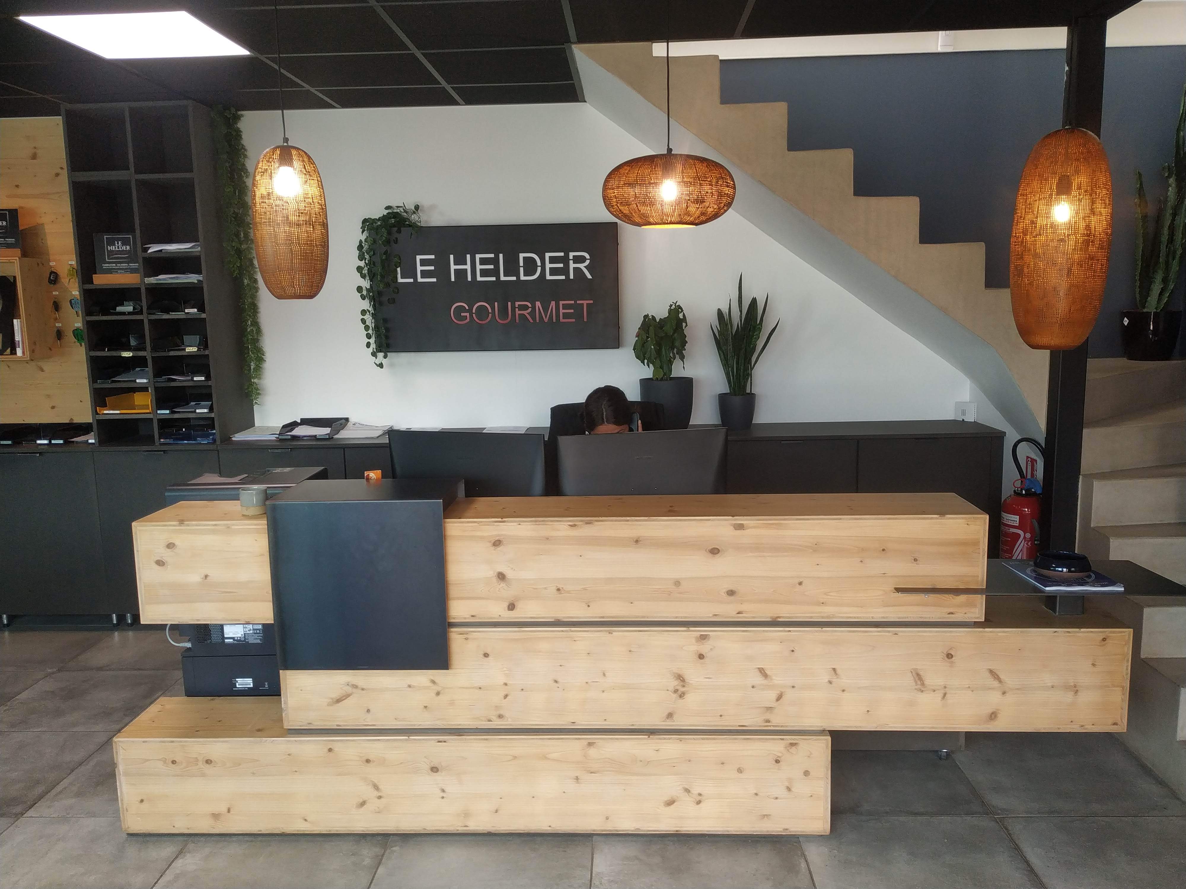 Ma mission : personnaliser et amener de la chaleur dans cet accueil pour coller à l’identité forte du Helder Gourmet, société familiale soudée autour d’une équipe forte et engagée dans le bon goût basco-landais. J’ai choisi de belles matières brutes, des luminaires cuivrés et des coussins en kilim ancien.