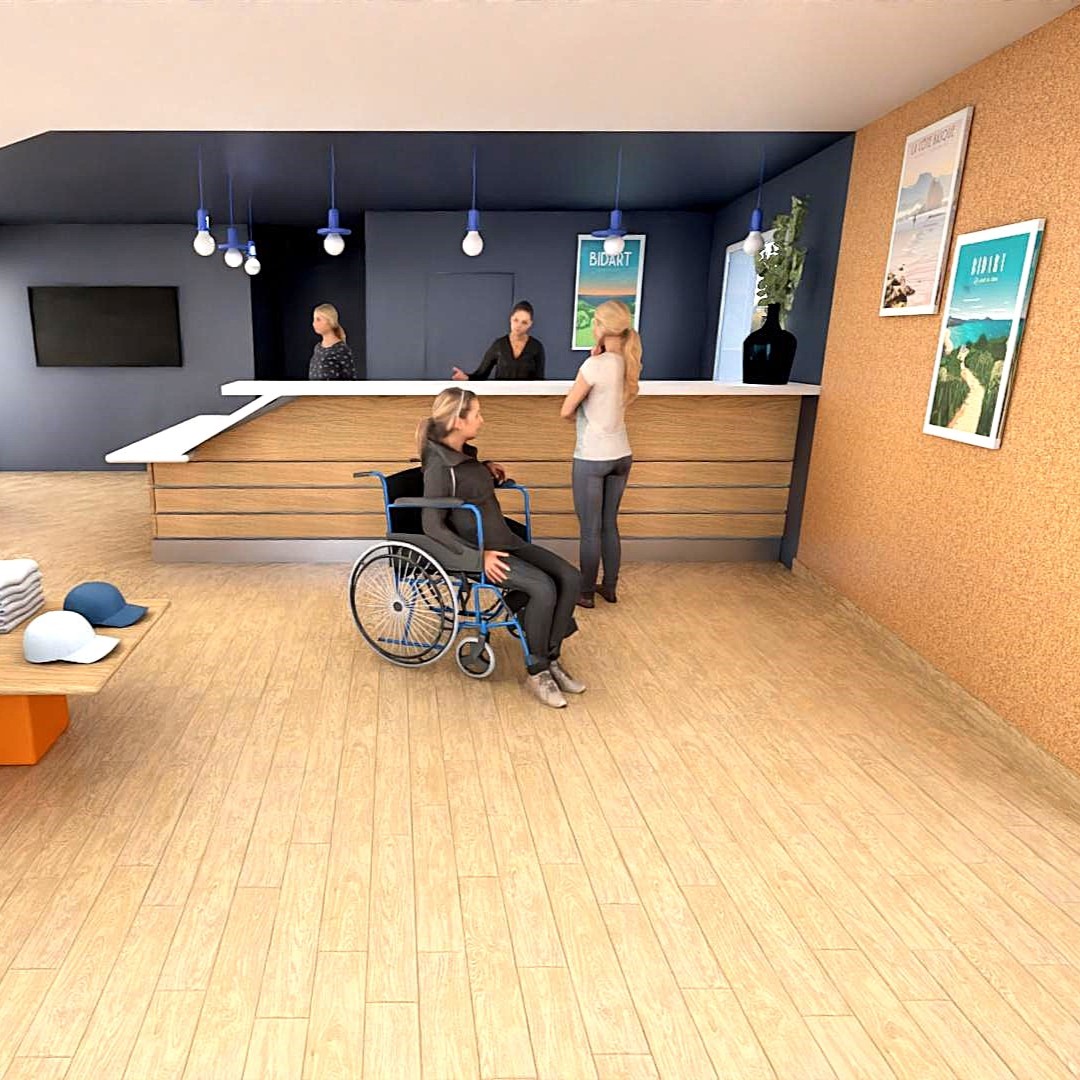 Pour les couleurs et les matières, j’ai choisi de m’inspirer de photos de nos couchers de soleil basques si particuliers en bleu et orange. J’ai sélectionné des teintes fortes : un orange vif dynamique et un bleu profond rassurant. Les matières seraient de qualité, dans les tons de sable beige avec des chênes miels et un liège brut. J’ai retravaillé les plans pour créer des espaces distincts et ludiques, faciles à vivre, notamment pensés pour les personnes à mobilité réduite :