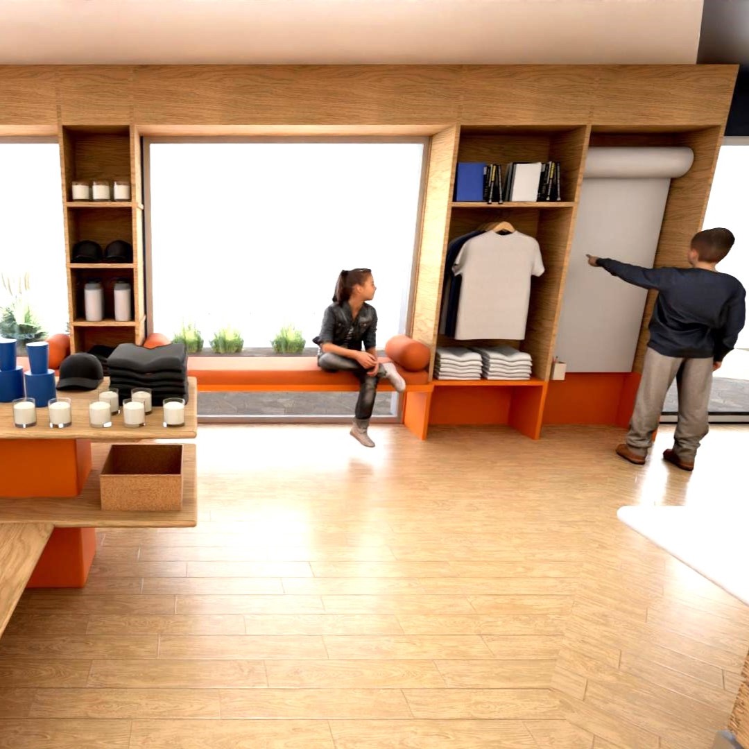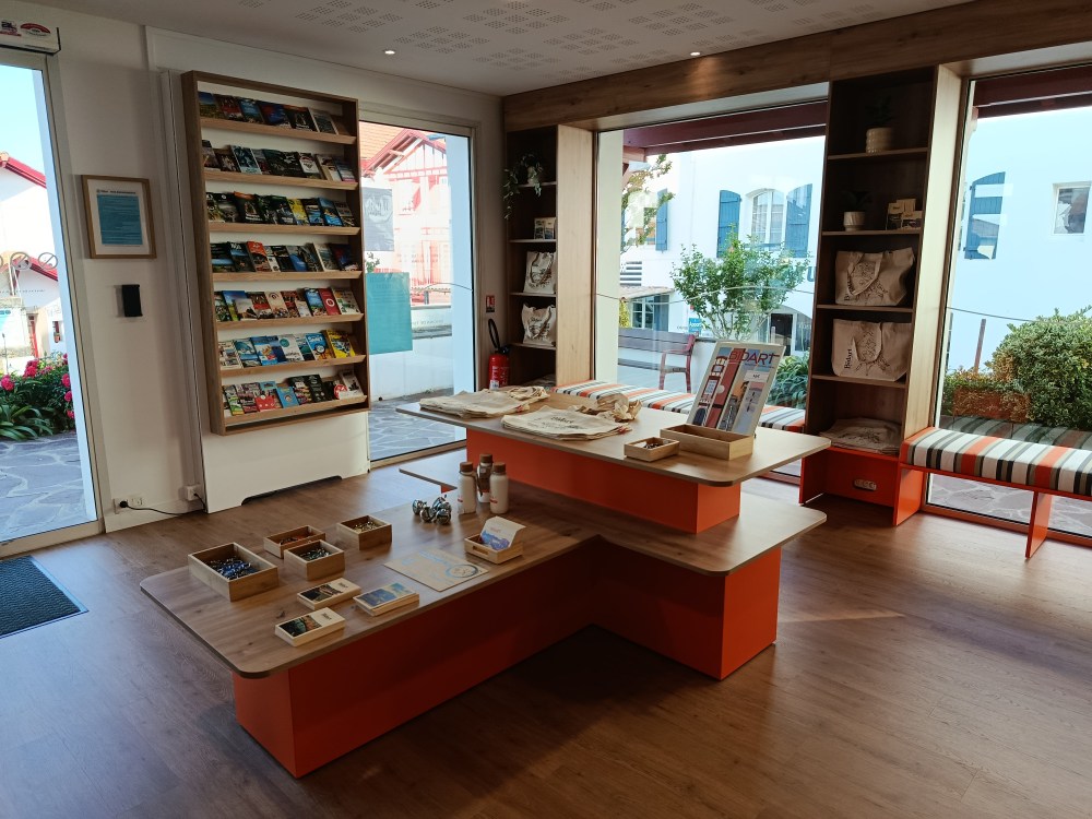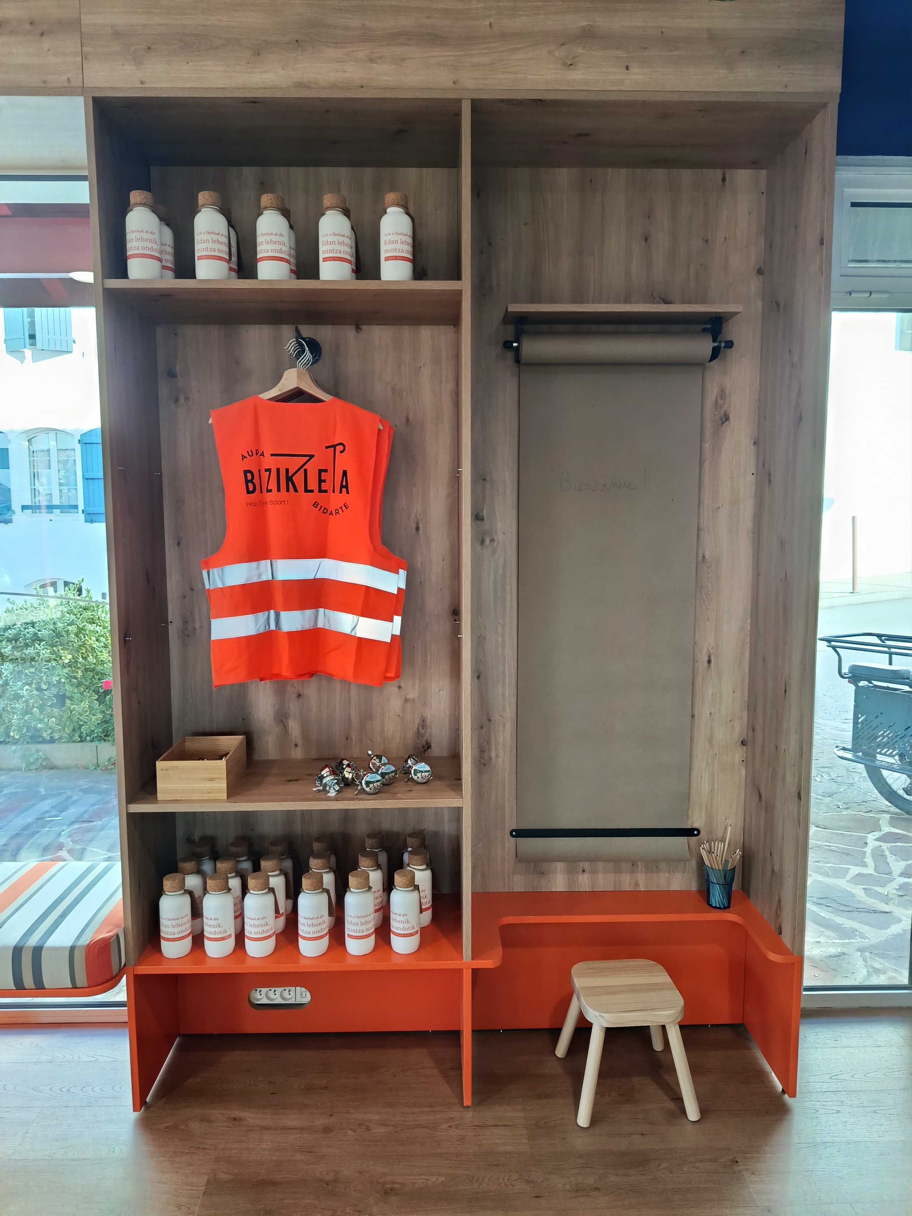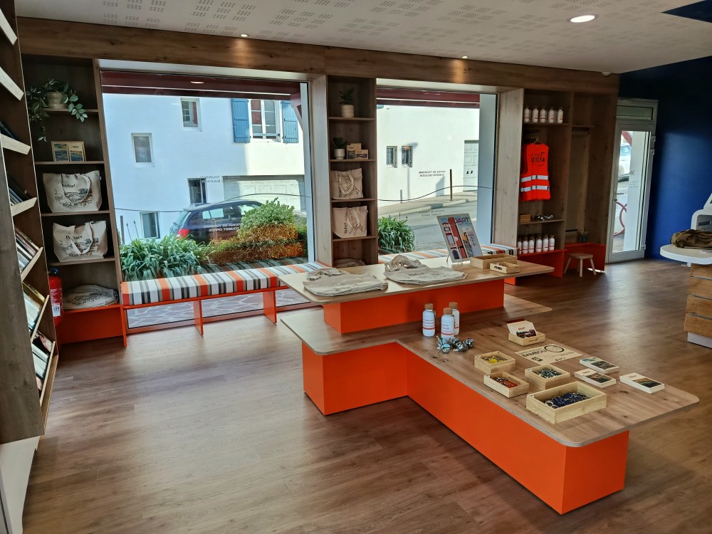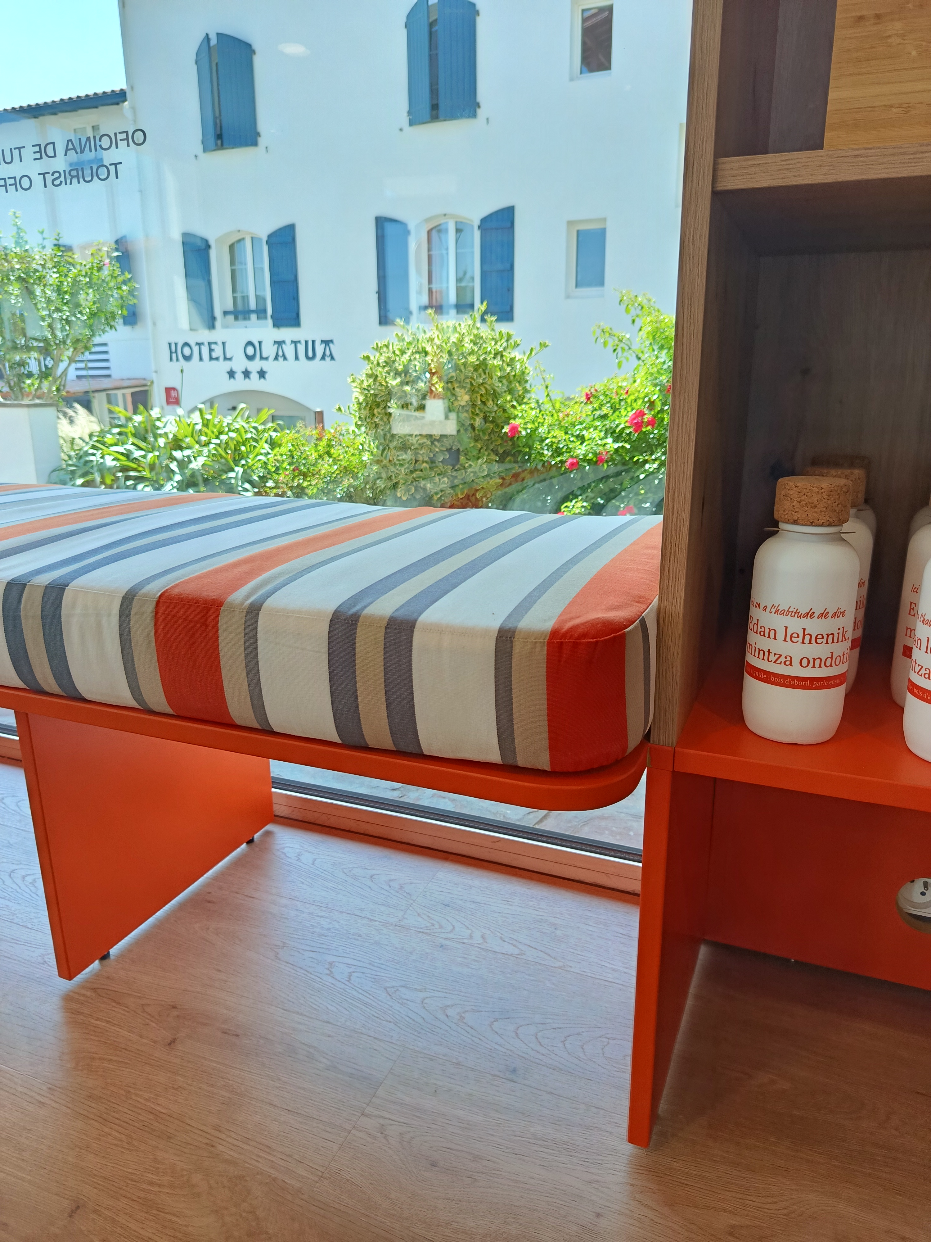 L’espace boutique est accessible et dynamique en orange vif et chêne clair : j’ai dessiné et le menuisier a créé sur mesure de grandes bibliothèques et banquettes ouvertes sur les extérieurs, une table de présentation, un espace de dessin mural pour les enfants. La zone est à la fois pratique et ludique. Les banquettes, réalisées sur mesure avec un tissu basque par une tapissière de Saint Pée sur Nivelle, sont accueillantes et visibles depuis l’extérieur, comme un appel à la convivialité et au temps de pause…