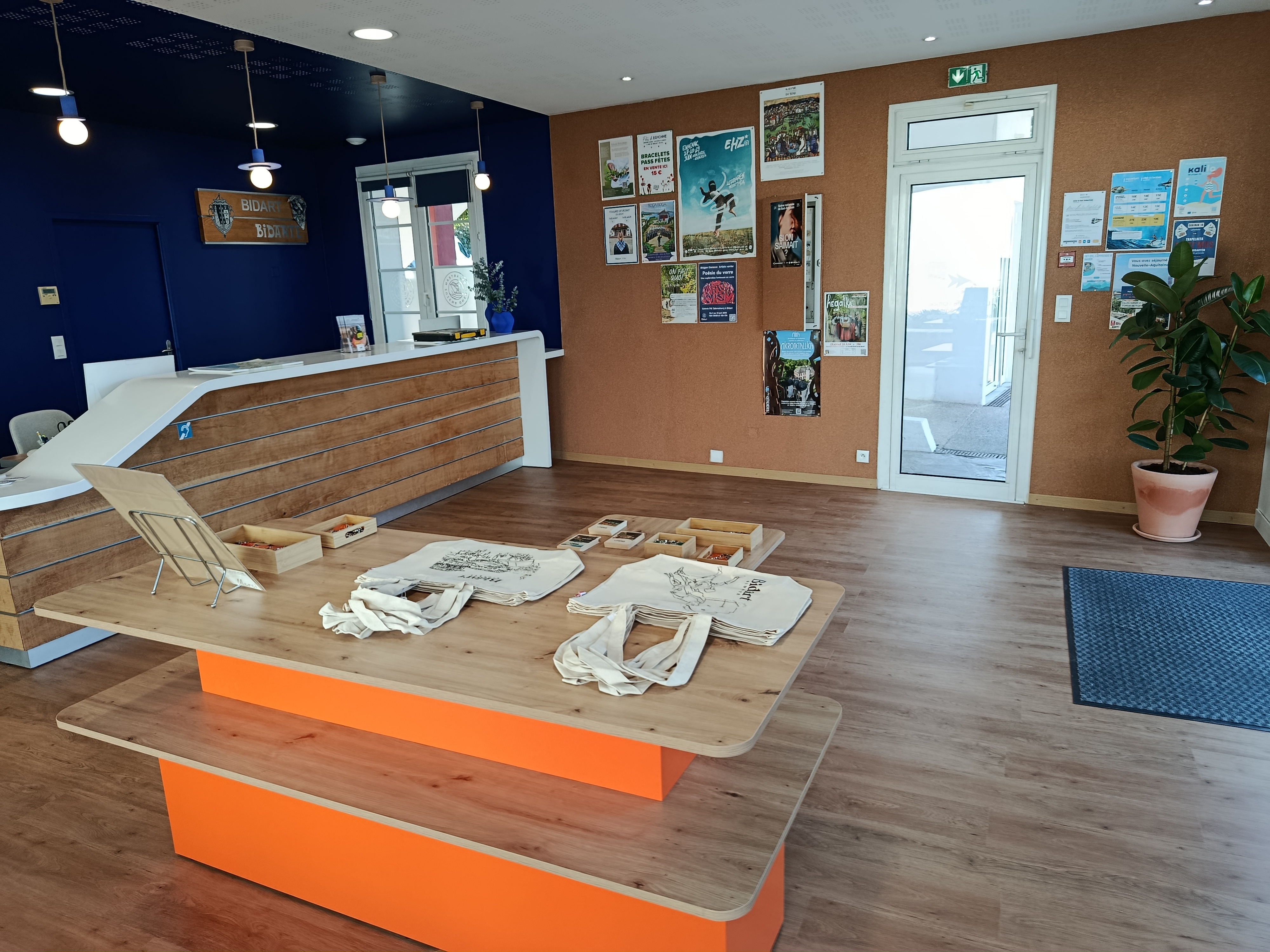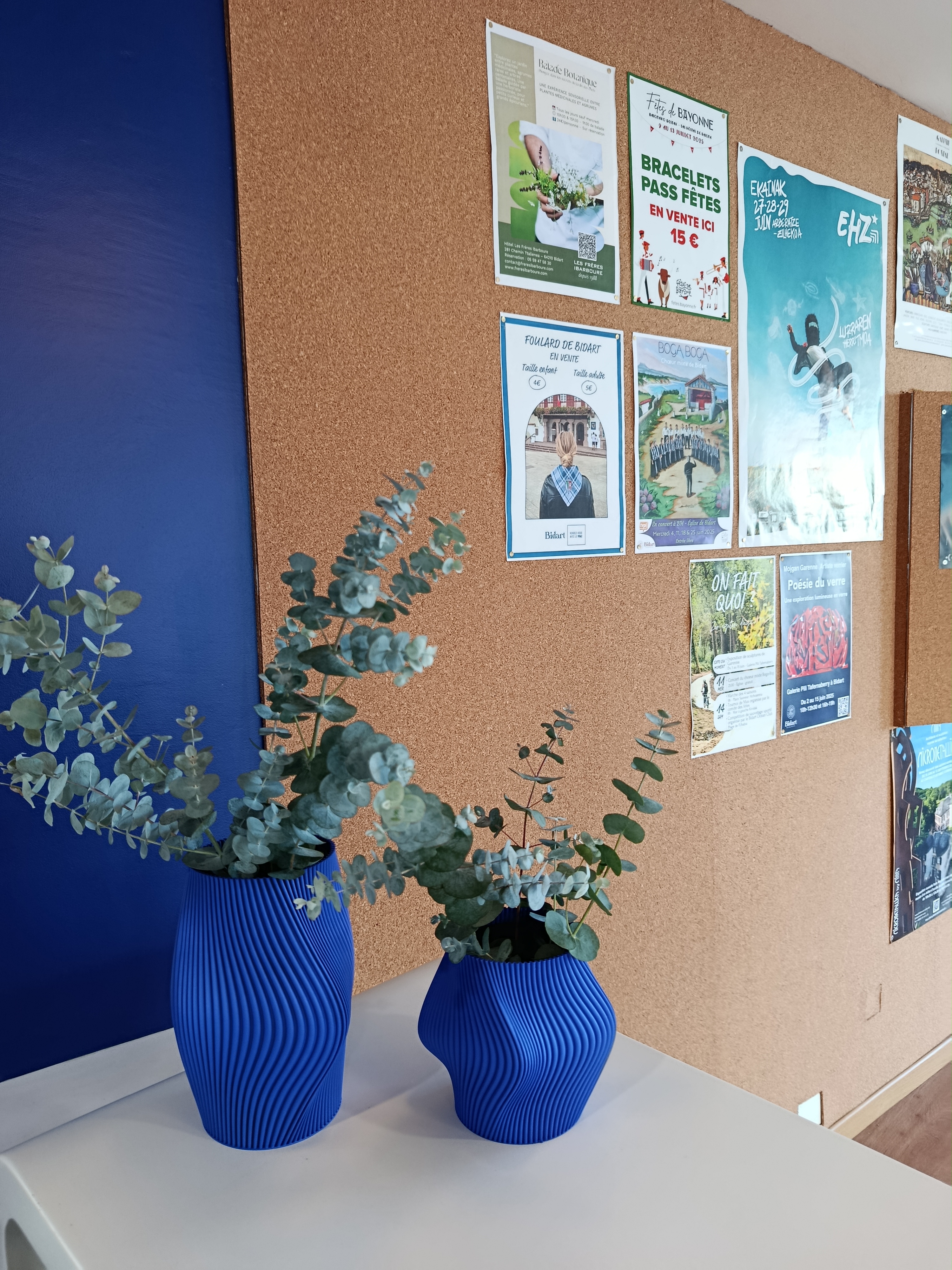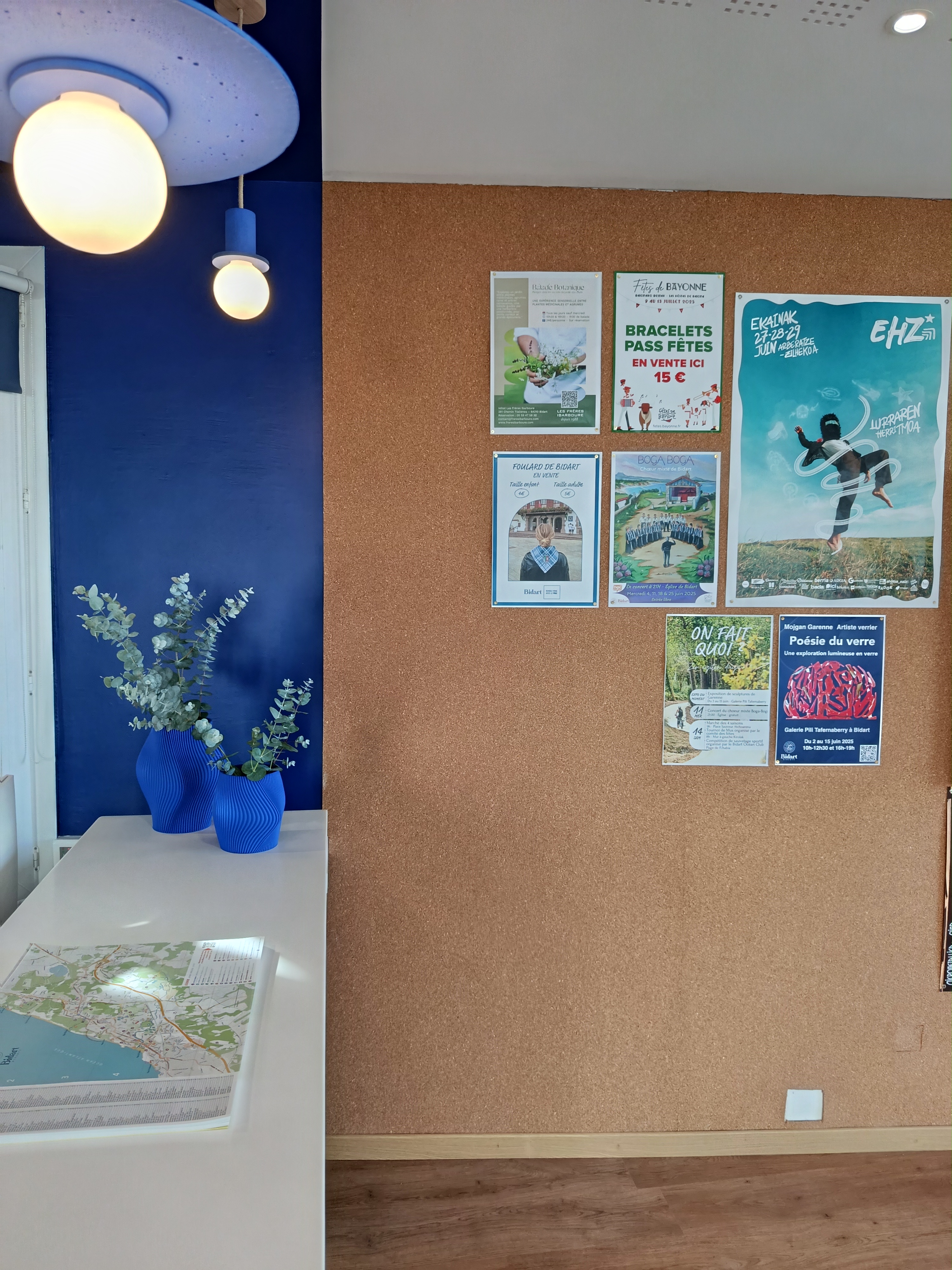 Si tout l’ancien sol carrelé a été recouvert d’un parquet chêne miel, j’ai repensé l’espace d’accueil et d’information en bleu foncé et liège, comme un cocon sécurisant et apaisant. Les luminaires en béton créés par l’artiste locale Zuri et les vases PRZ en biomaïs recyclés, amènent le peps et l’originalité du bleu Klein. Un mur de liège épais regroupe l’ensemble des affiches de communication : ce liège est fabriqué dans les Landes par une société familiale, Agglolux. Les étagères pour les flyers ont été réalisées sur mesure par un menuisier de Bidart, Damien Belmère. Les peintures ont été réalisées par un peintre local, Gregory Rochut.