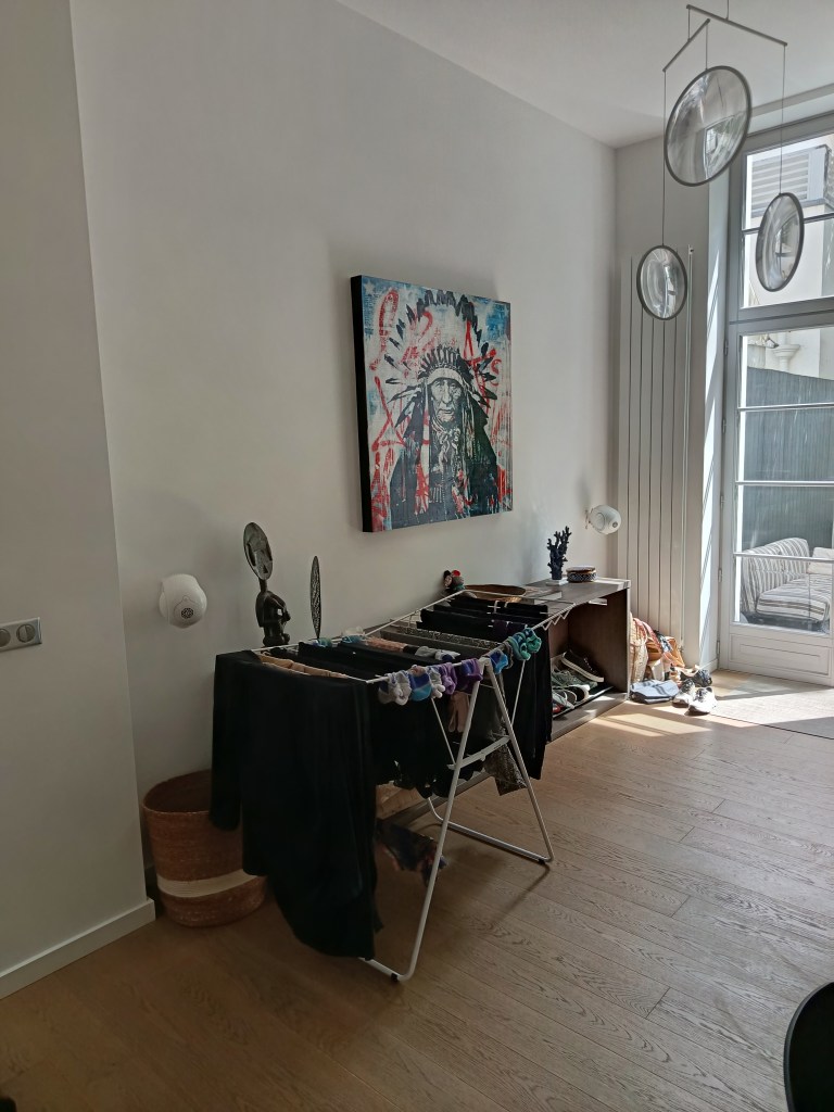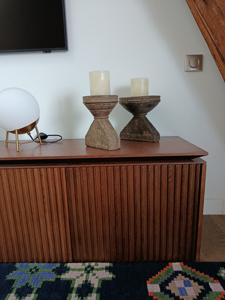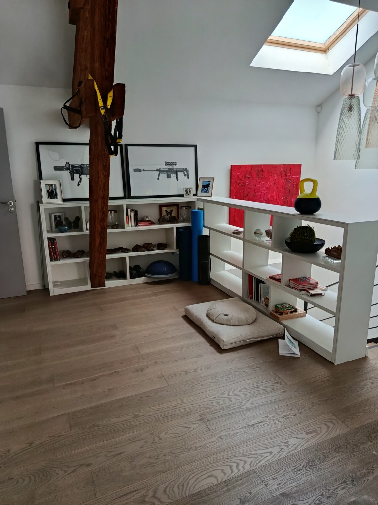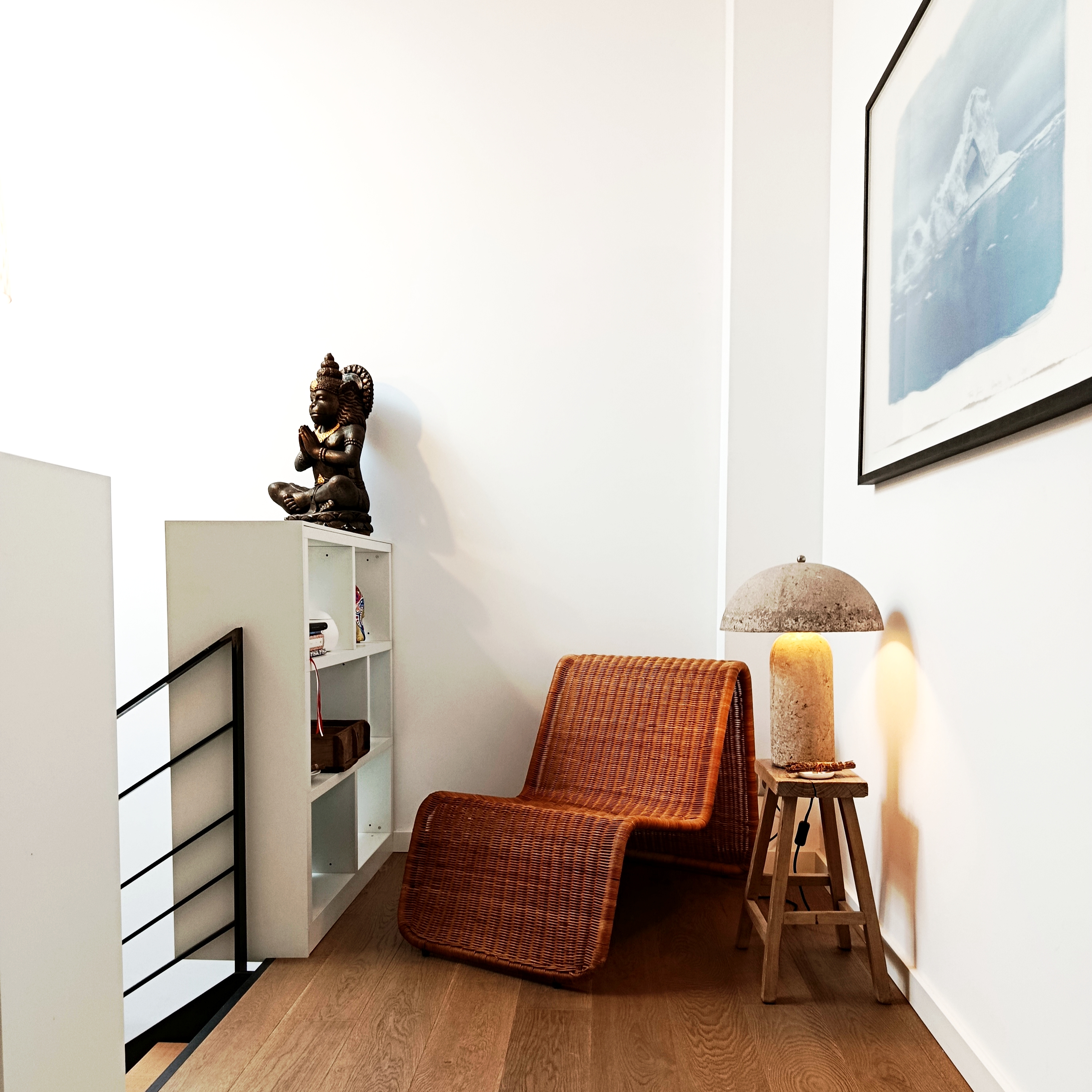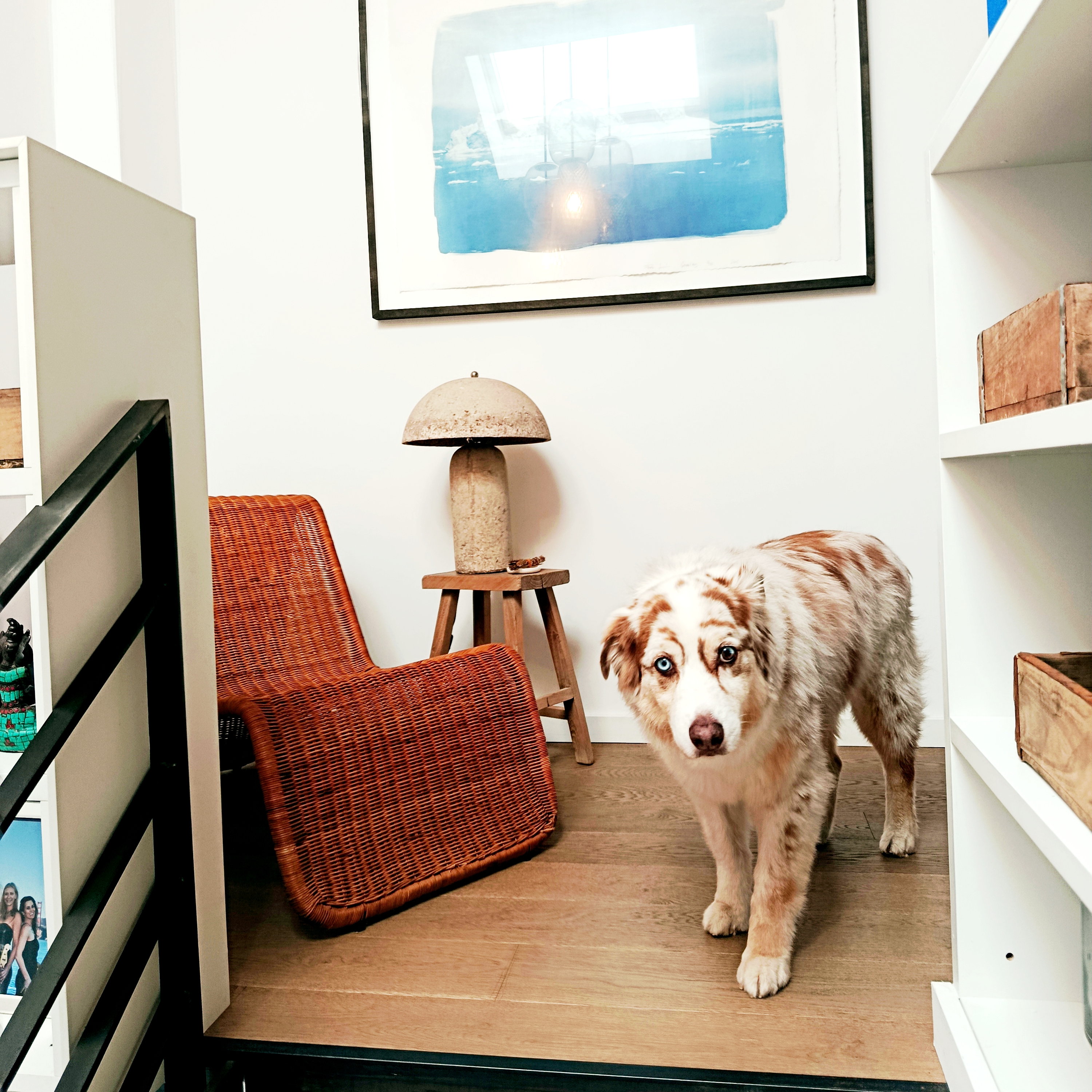 Quand Lexi m’a sollicité pour décorer et réaménager sa jolie petite maison dans l’ancien quartier de pêcheurs de Biarritz, j’avais hâte de transformer l’espace : apporter de la vie, de la chaleur, des objets ou des meubles avec une histoire, des matières patinées, des lumières diffuses… A cela s’est ajouté un travail de rangement, pour aérer les pièces et leur donner une fonctionnalité. J’ai créé un espace yoga ouvert et lumineux, hyper accueillant quand on arrive à l’étage… toujours sous l’oeil canin attentif de Sanson…