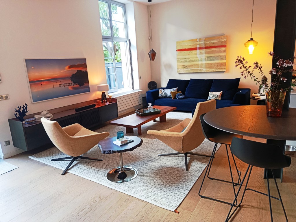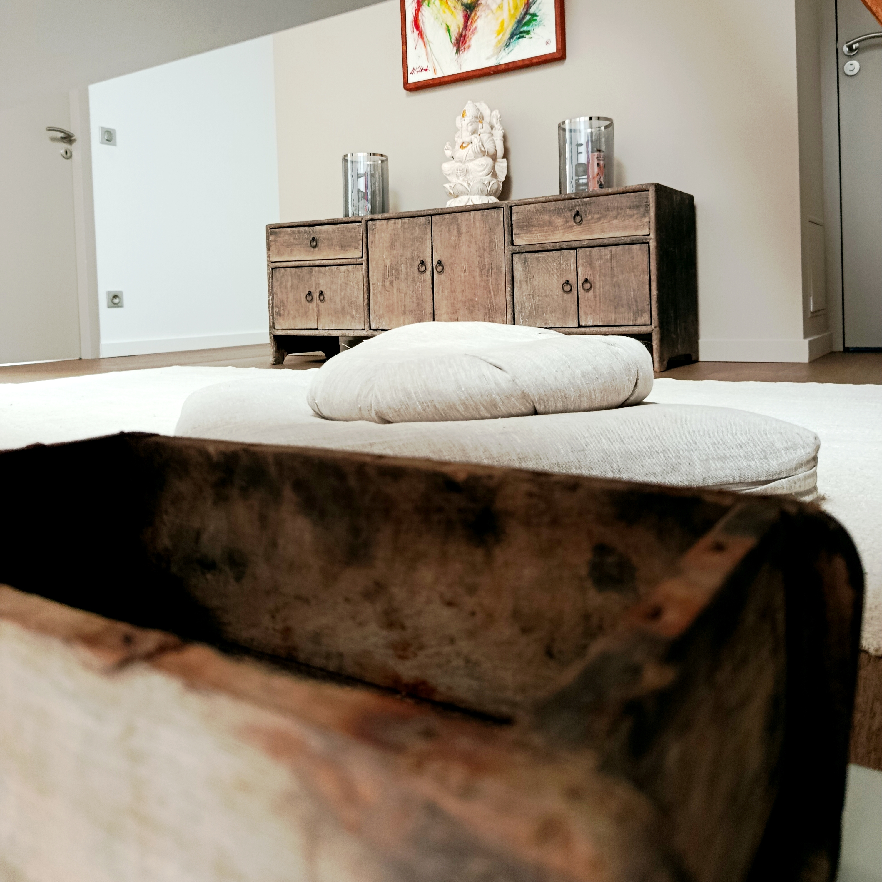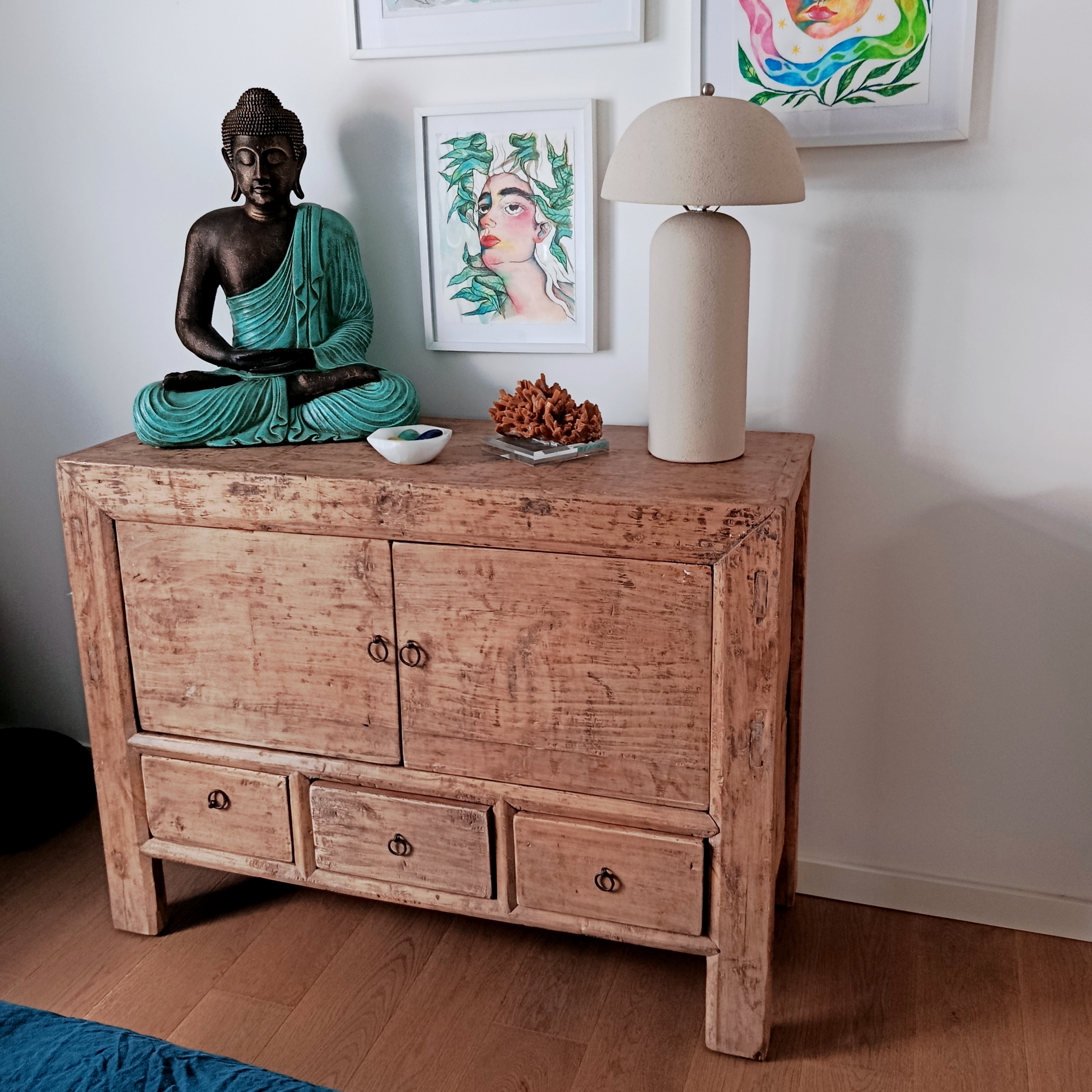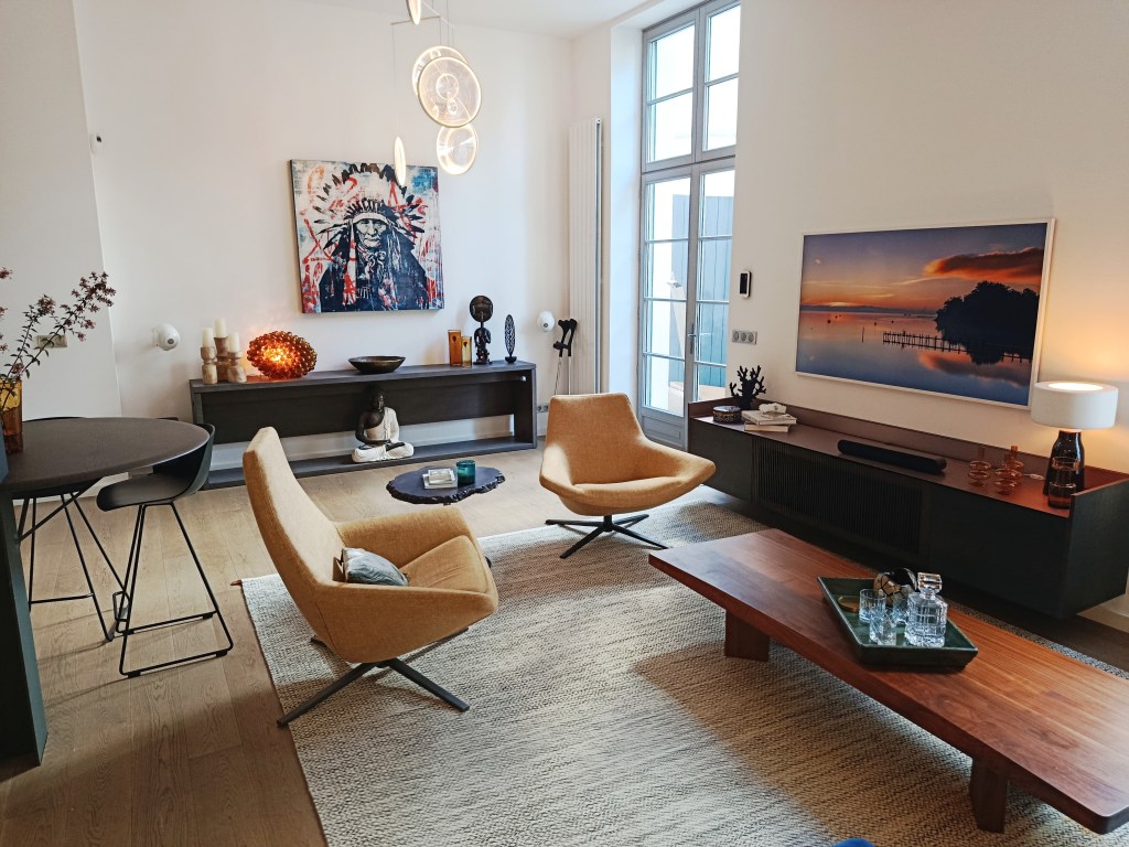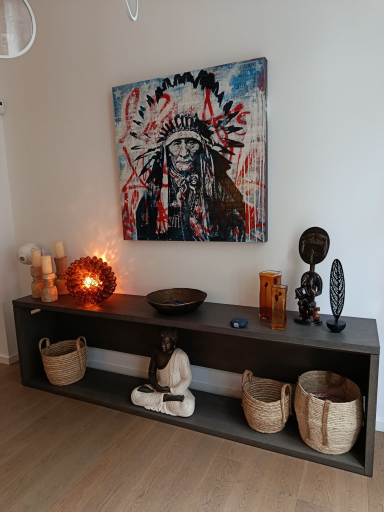 Quand Lexi m’a sollicité pour décorer et réaménager sa jolie petite maison dans l’ancien quartier de pêcheurs de Biarritz, j’avais hâte de transformer l’espace : apporter de la vie, de la chaleur, des objets ou des meubles avec une histoire, des matières patinées, des lumières diffuses… A cela s’est ajouté un travail de rangement, pour aérer les pièces et leur donner une fonctionnalité. J’ai créé un espace yoga ouvert et lumineux, hyper accueillant quand on arrive à l’étage… toujours sous l’oeil canin attentif de Sanson…